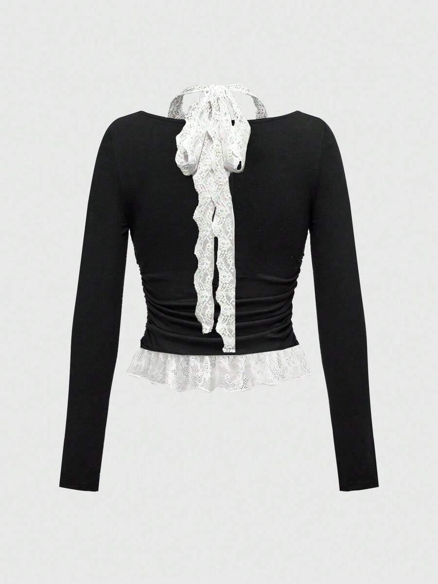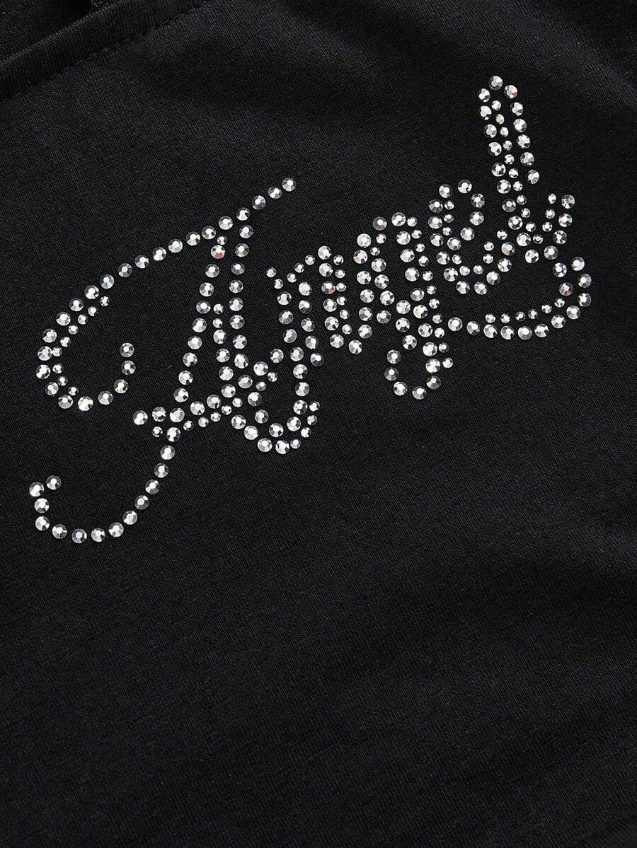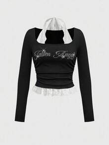 ROMWE Avant Camiseta de manga larga ajustada con cuello redondo, parche de strass y encaje con diseño de letras estilo punk para mujer