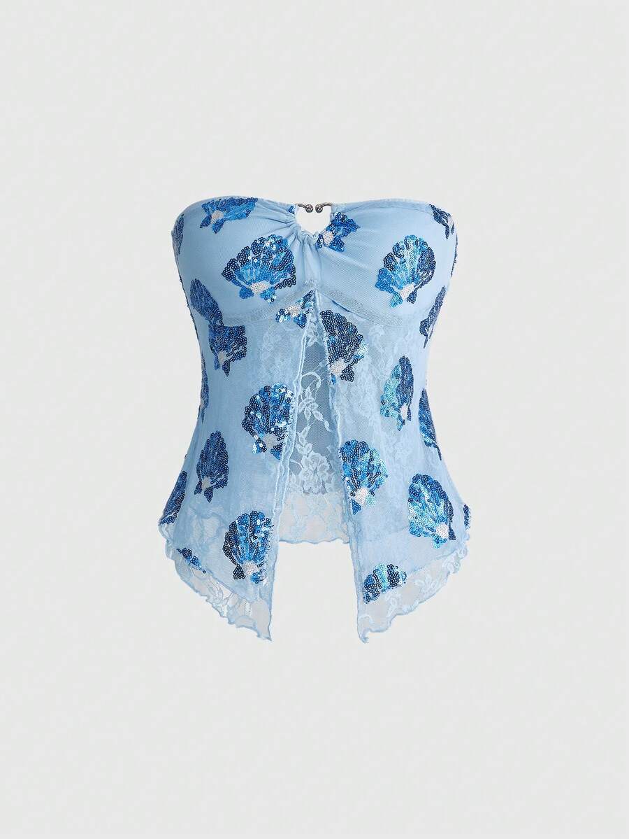 ROMWE Avant Top de camisola con bordado de conchas marinas, lentejuelas y encaje calado en contraste, sexy para el verano