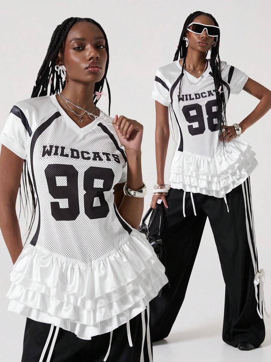 ROMWE Avant Top de mujer con estampado dulce y deportivo, con volantes, pedrería y perlas