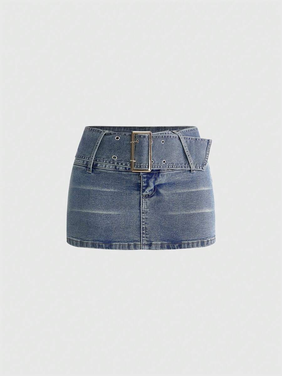 ROMWE Avant Minifalda de mezclilla con cintura alta y baja, con efecto desgastado, estilo retro sexy Y2K para mujeres