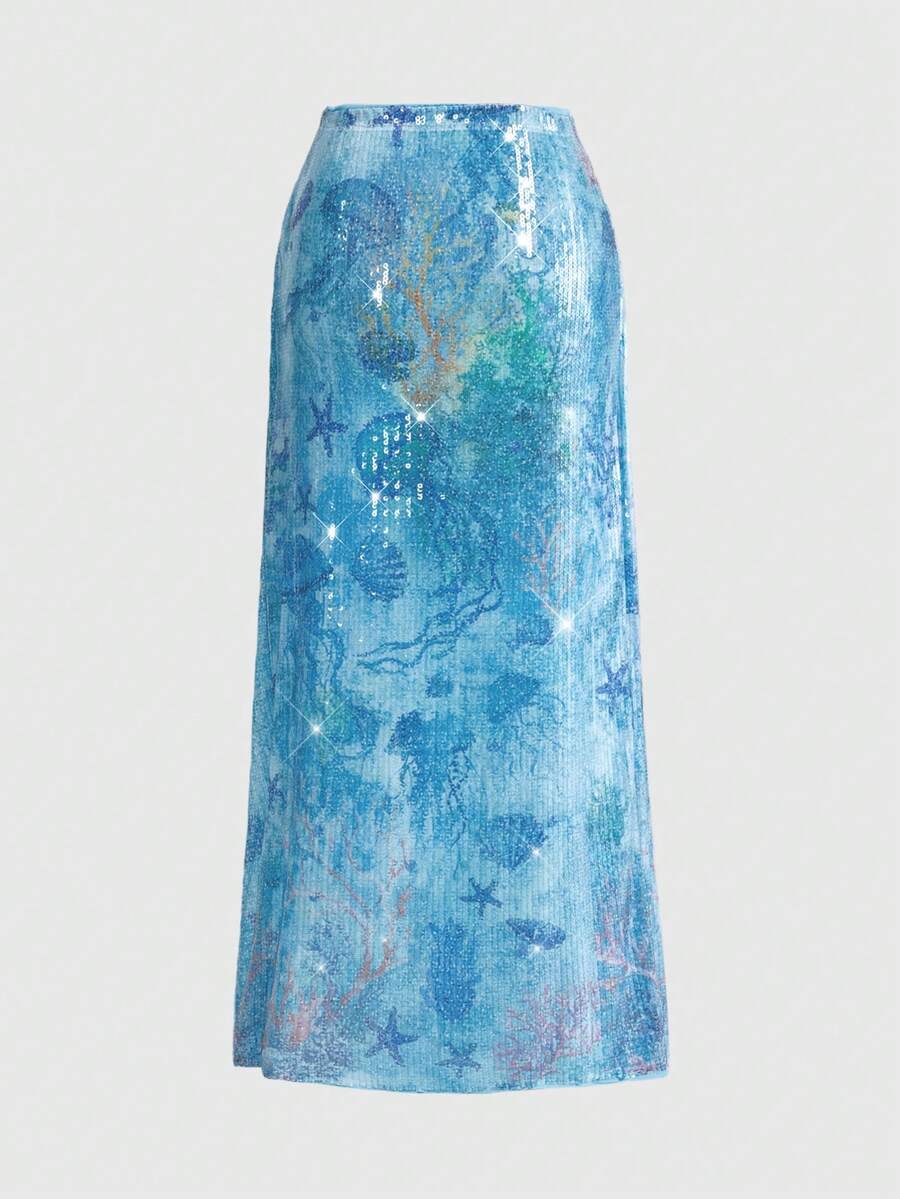 ROMWE Avant Falda con abertura alta, estampado de animales marinos, coral, estrella de mar y lentejuelas, con cintura anudada, para vacaciones de mujer