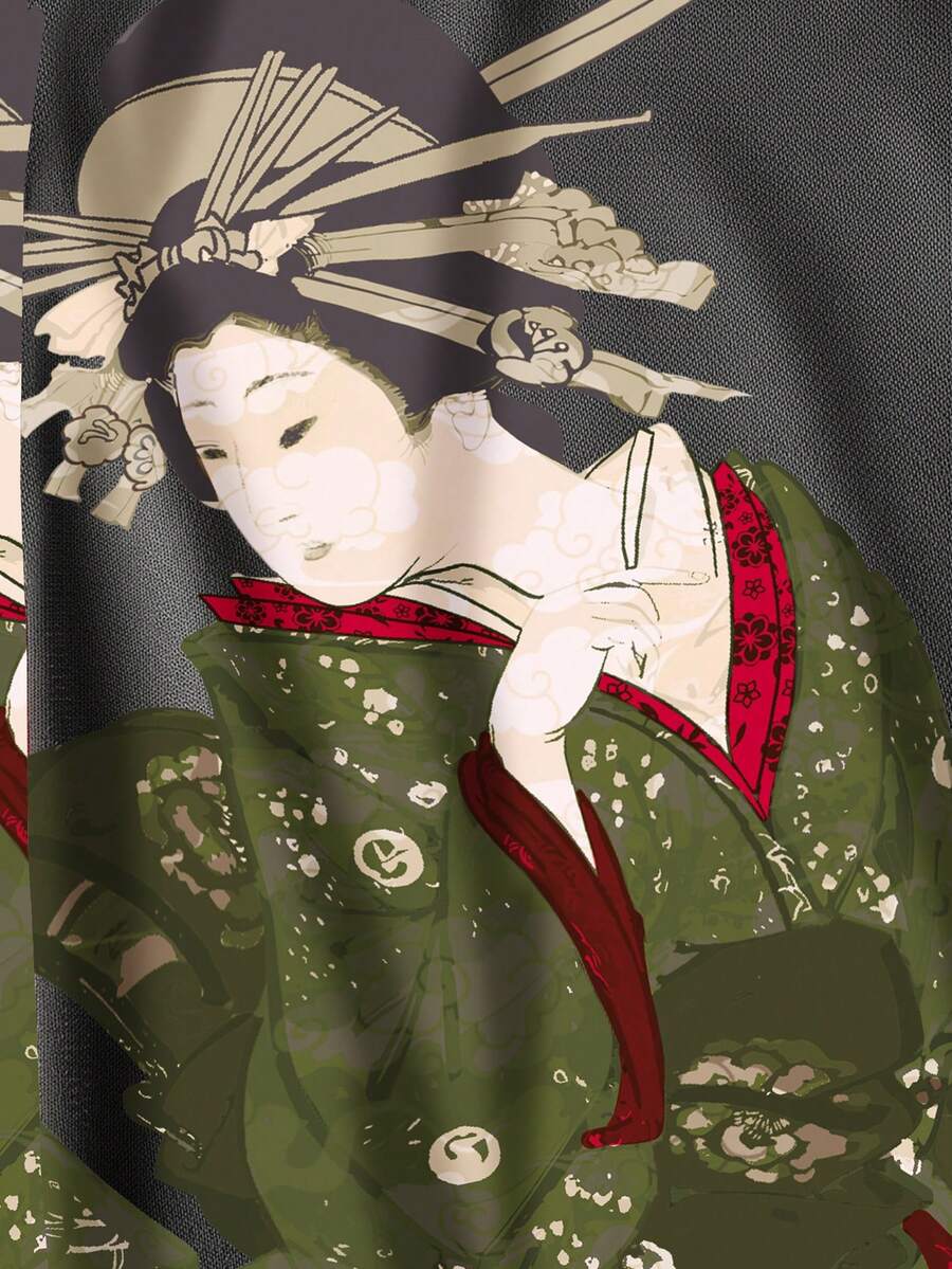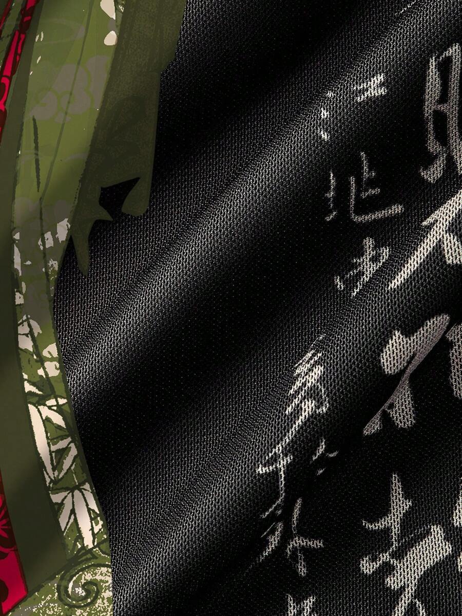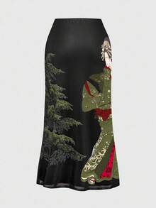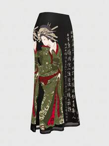 ROMWE Avant Falda de malla con abertura lateral con estampado de caligrafía japonesa vintage de geisha y árbol de pino para mujer