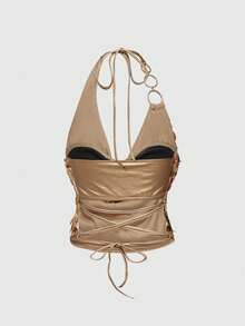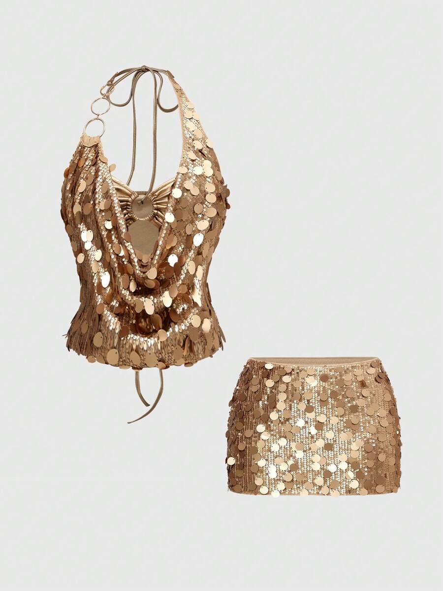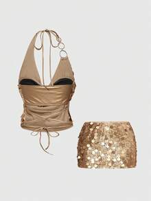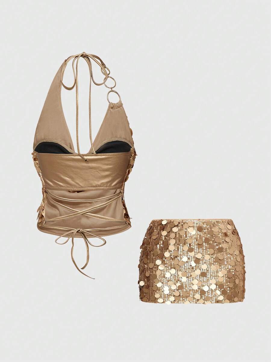 ROMWE Avant Conjunto de 2 piezas de top corto halter con lentejuelas y minifalda de cintura baja con estilo vintage y sexy para mujer