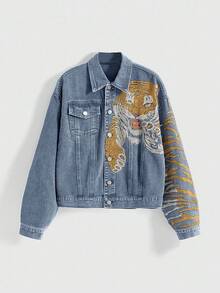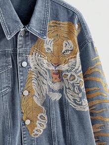ROMWE Avant Chaqueta vaquera con bordado 3D de estampado de tigre estilo callejero vintage, unisex