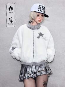 ROMWE Avant Chaqueta con cremallera, cuello de piel sintética y bordado de letras y estrellas para mujer, para otoño/invierno