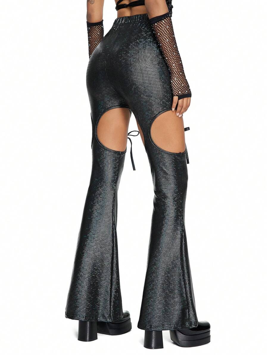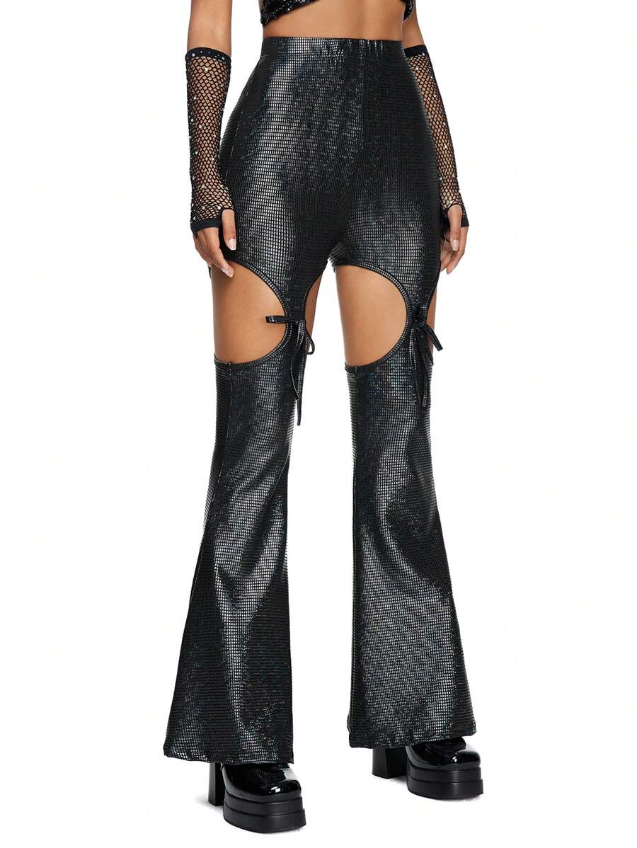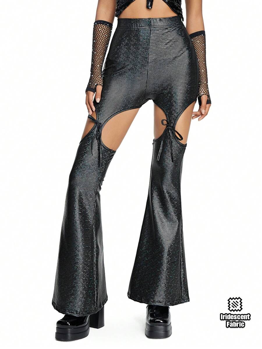 ROMWE Avant Pantalones acampanados de cintura alta con lazo de tela recortada con textura láser para mujer, para festivales de rave