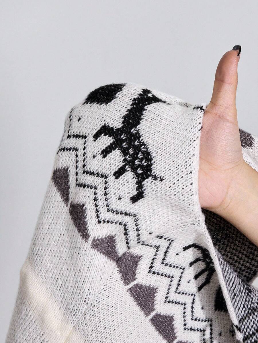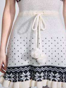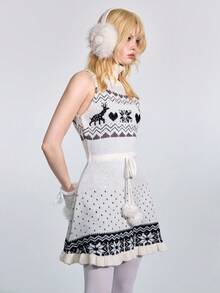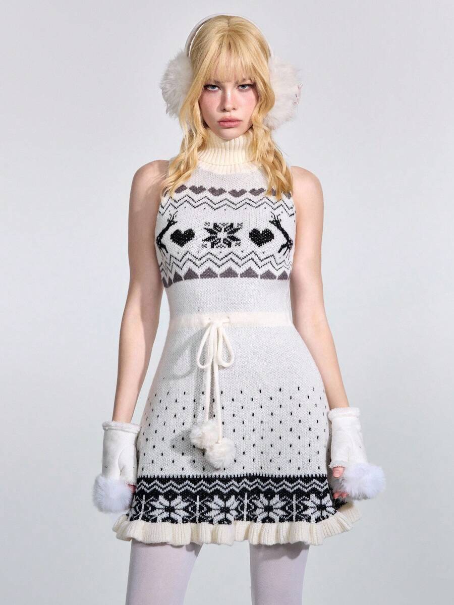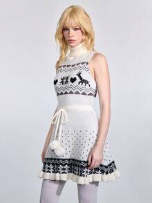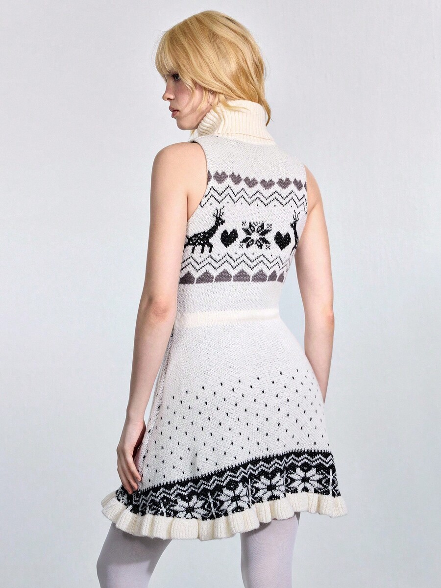 ROMWE Avant Vestido de suéter ajustado con cuello alto, sin mangas, con estampado de ciervos jacquard y cintura con lazo, de estilo retro Fair Isle para mujer
