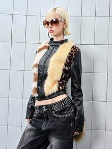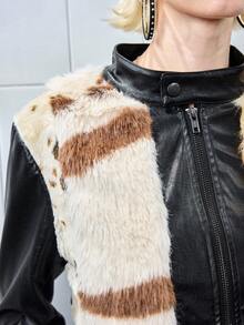 ROMWE Avant Chaqueta de motociclista de mujer con estilo retro hippie para festival de música, de telas mixtas esponjosas, cuello alto, cintura ceñida, de cuero sintético