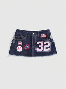 ROMWE Avant Minifalda ajustado sexy de cintura baja con falda de mezclilla desconstructiva y bordado de logotipo con eslogan