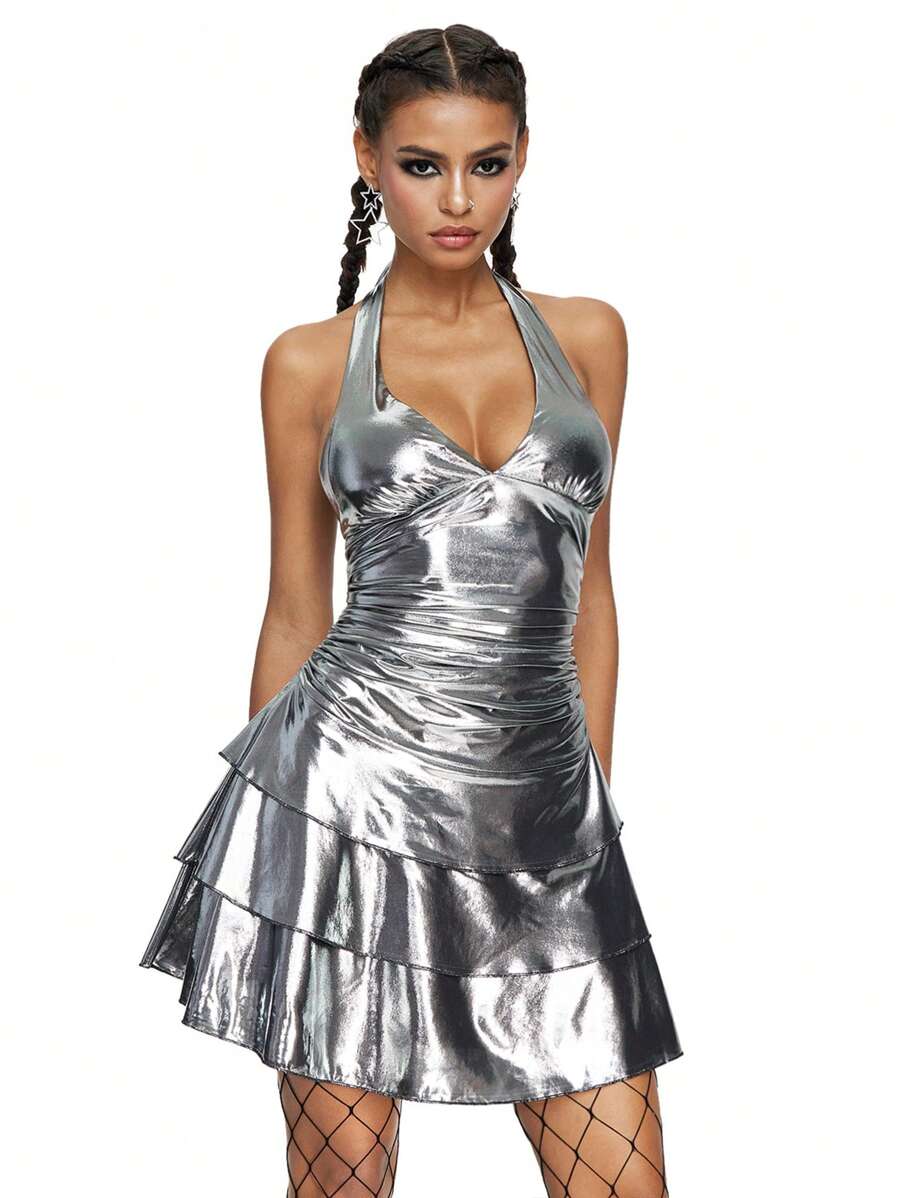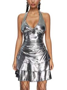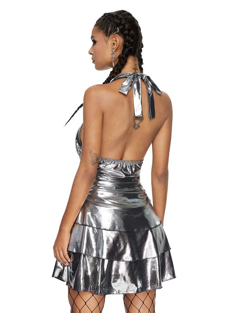 ROMWE Avant Vestido mini de halter para mujer en plata brillante con cuello en V y espalda atada con lazo, ideal para rave festival estilo Y2K