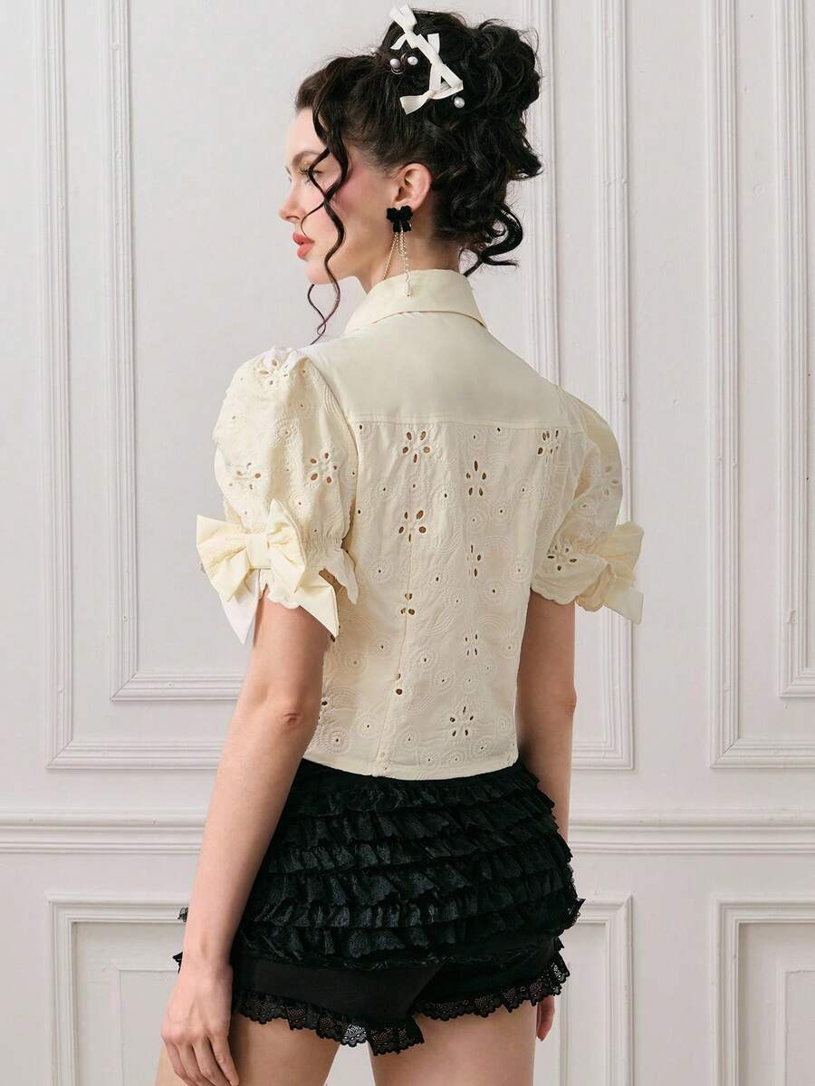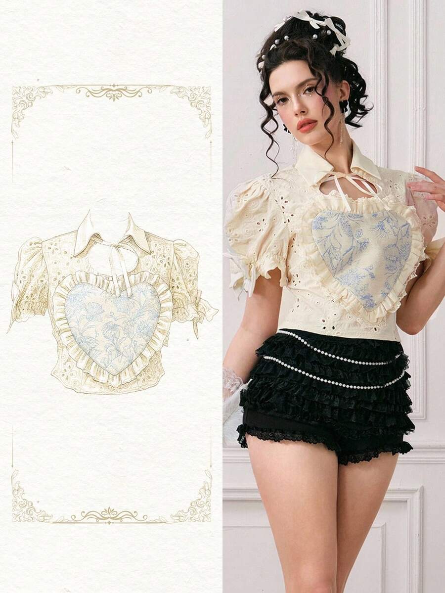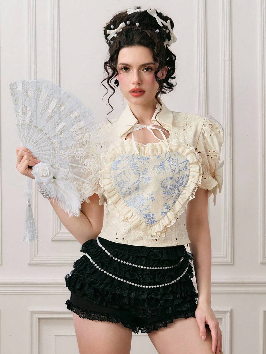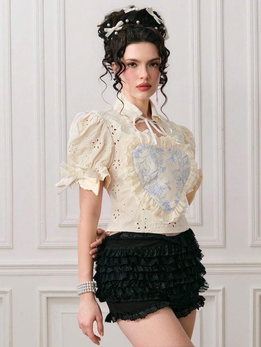 EDITION Blusa de moda con bordados, mangas cortas abullonadas y volantes con estampado de plantas