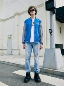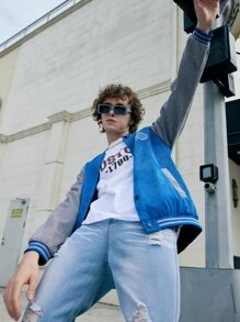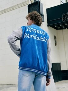 ROMWE Limited Hombres Cazadora de universidad con estampado de letra de pana sin camiseta
