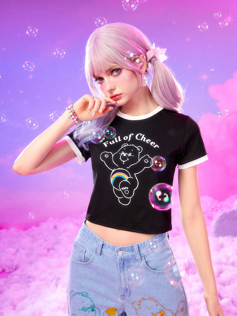 ROMWE X Care Bears Camiseta De Manga Corta Con Detalle De Contraste Con Estampado De Dibujos Animados Y Letras