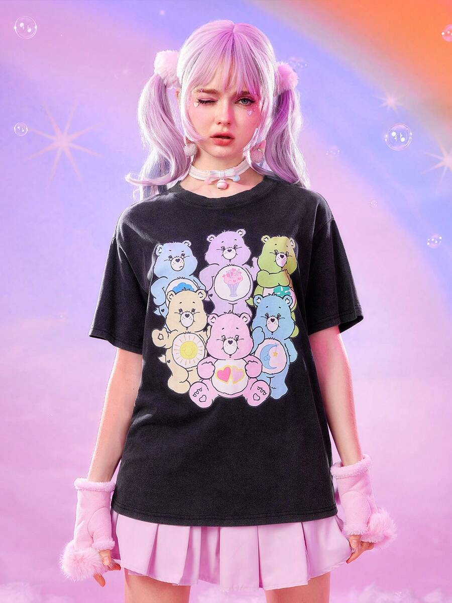 ROMWE X Care Bears Camiseta holgada para mujer con estampado de oso de dibujos animados gracioso, en tela de algodón vintage con efecto desgastado y cepillado