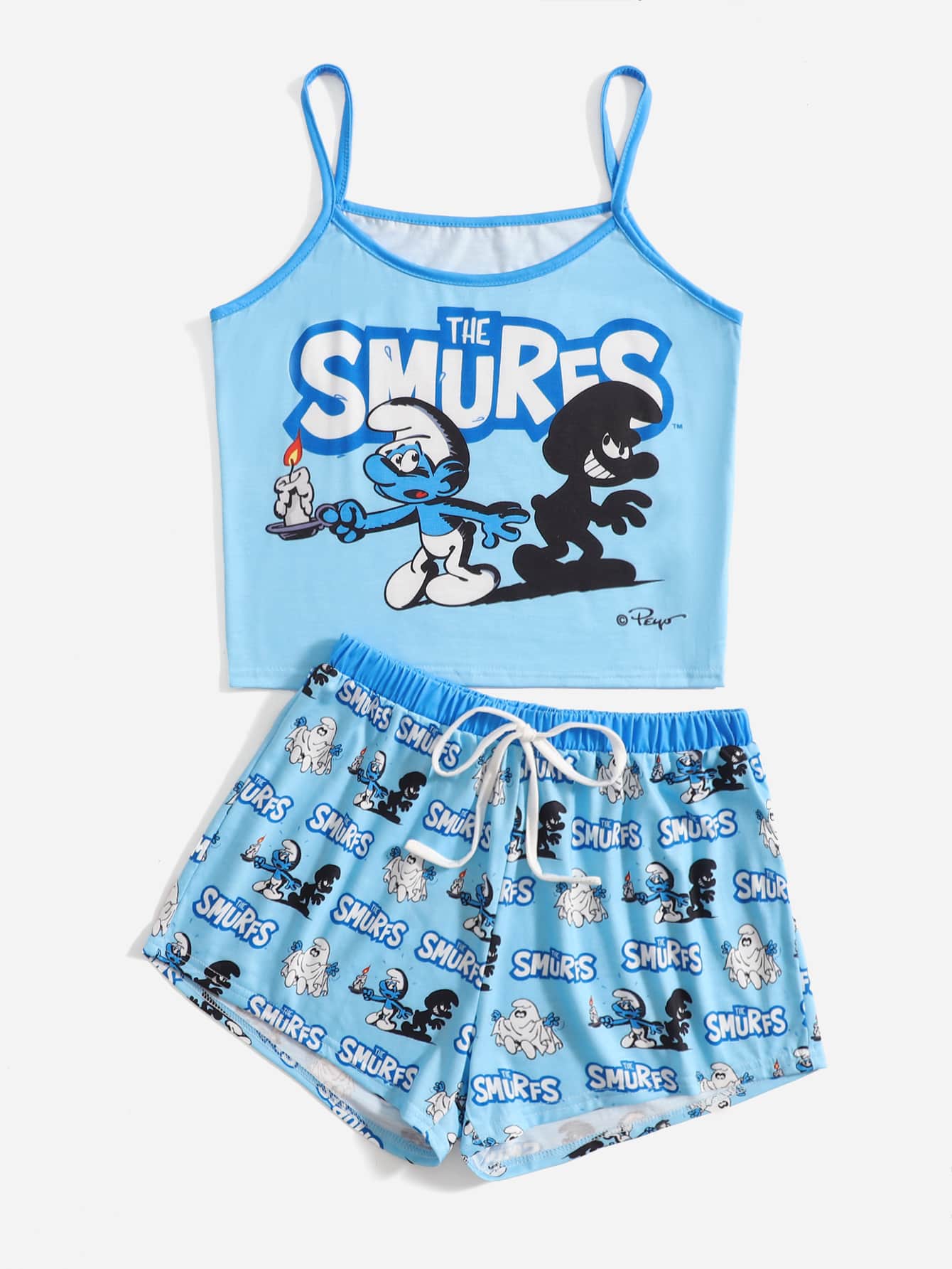 ROMWE X The Smurfs Conjunto de pijama con gráfica de dibujos animados con letra, decoración de nudo, para escuela