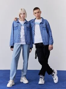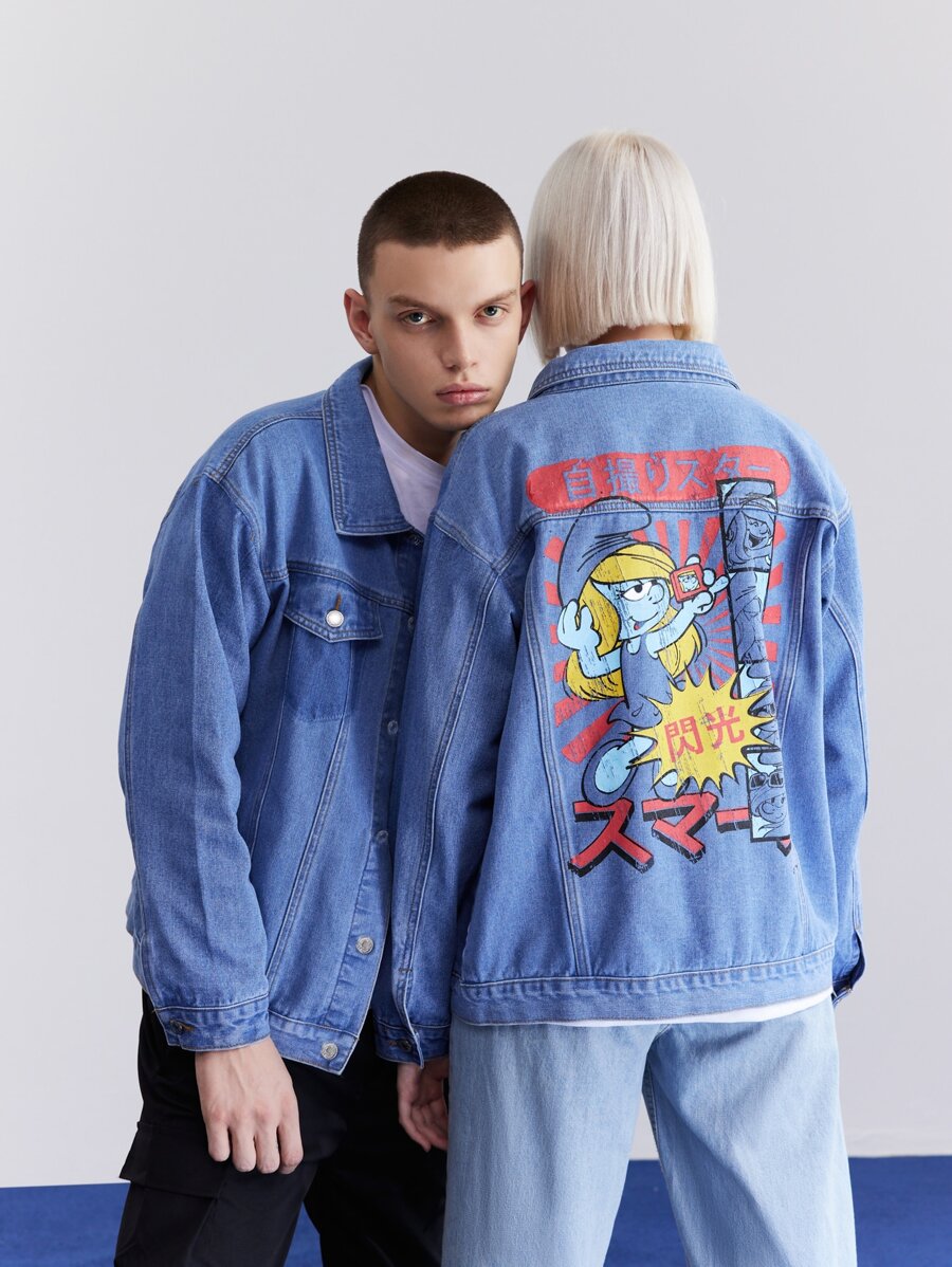 ROMWE X The Smurfs 1 pieza Cazadora mezclilla unisex con estampado de dibujos animados