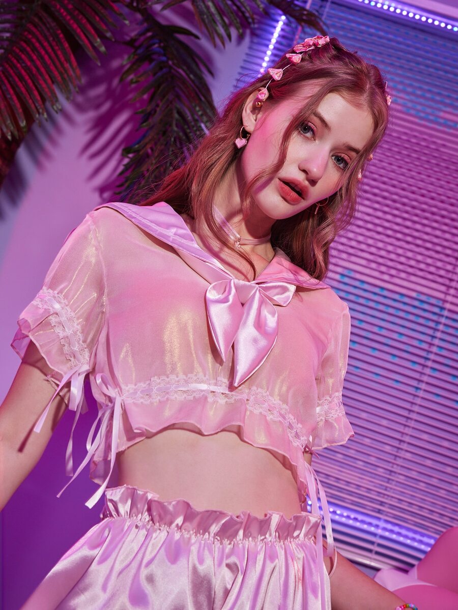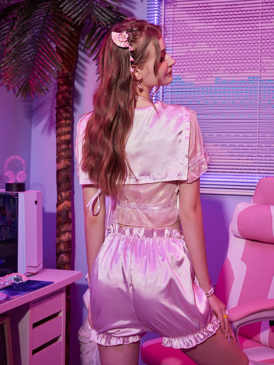 Anime 3 piezas Set de lencería de satén cuello marinero fruncido con encaje en contraste