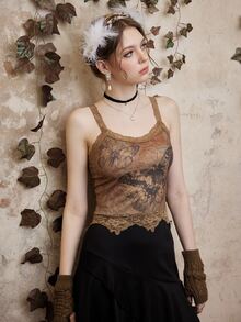 Fairycore Top de tirantes con estampado de mariposa ribete con encaje