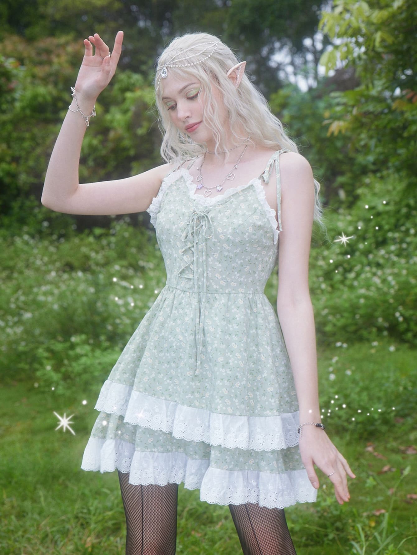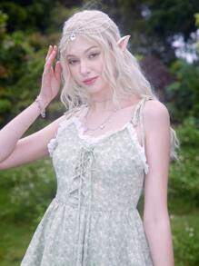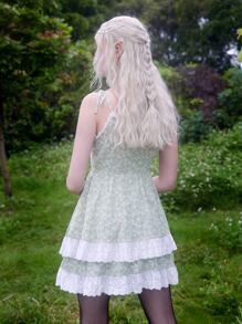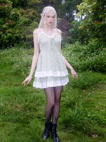 Fairycore Vestido de verano ribete con encaje floral con cordón