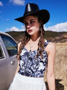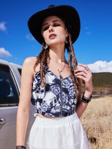 Goth Tank top con cremallera con estampado floral con cráneo