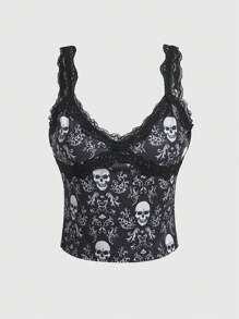 Goth Top de tirantes estampado de cráneo con encaje en contraste