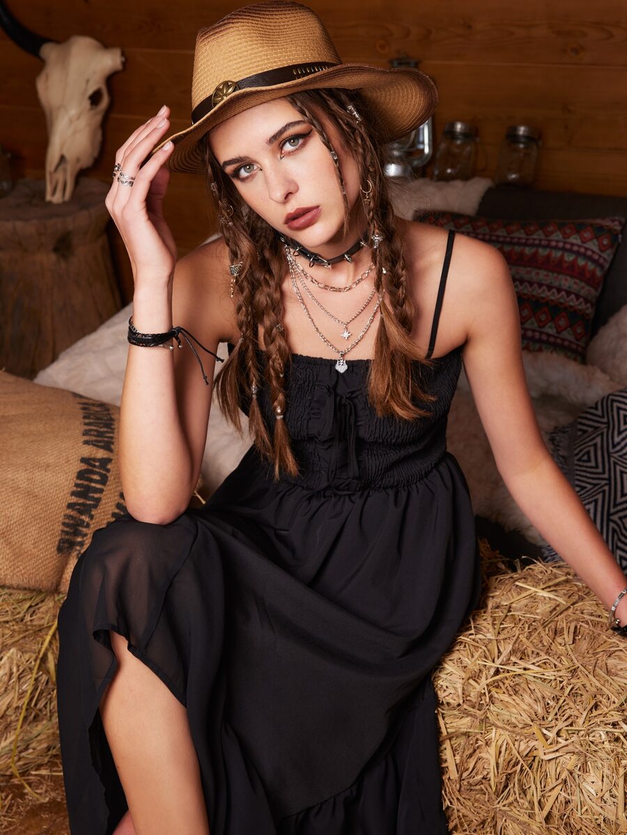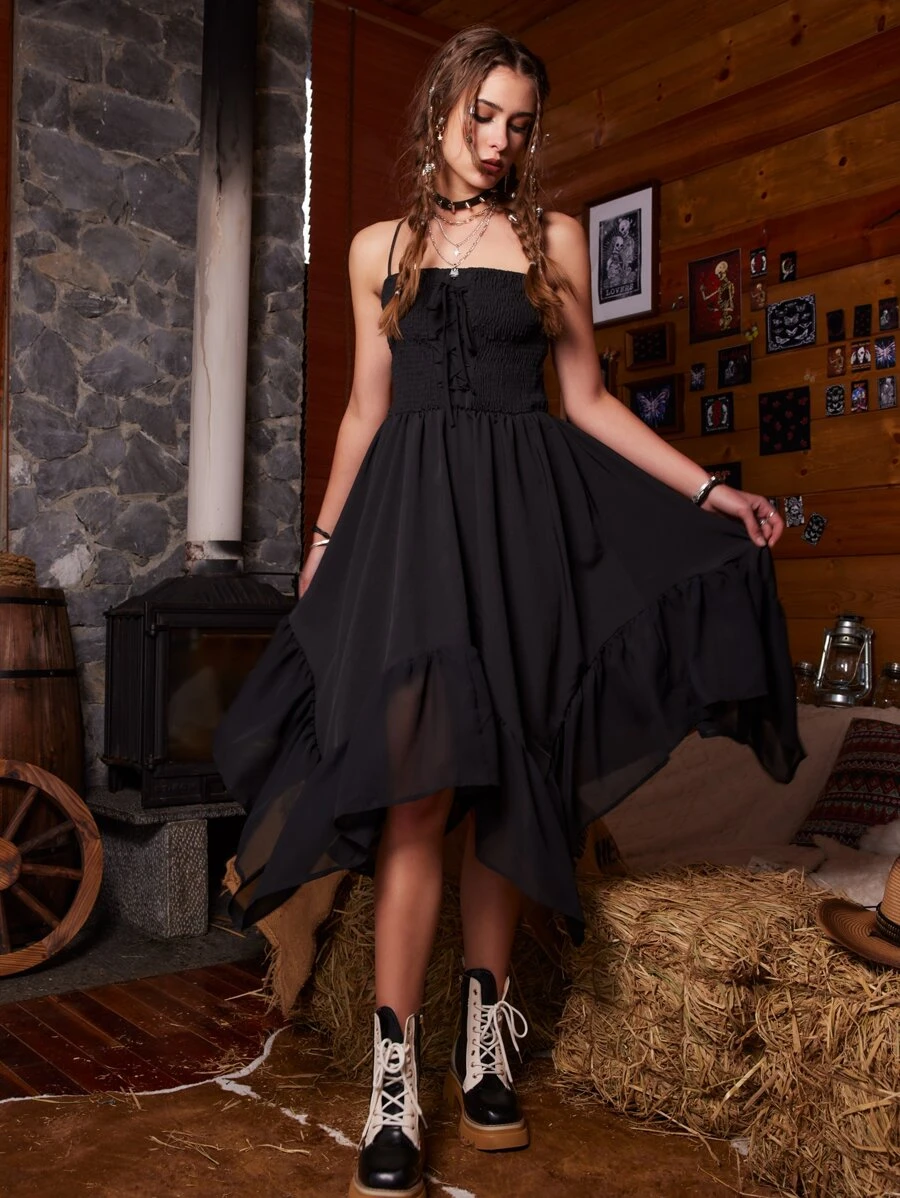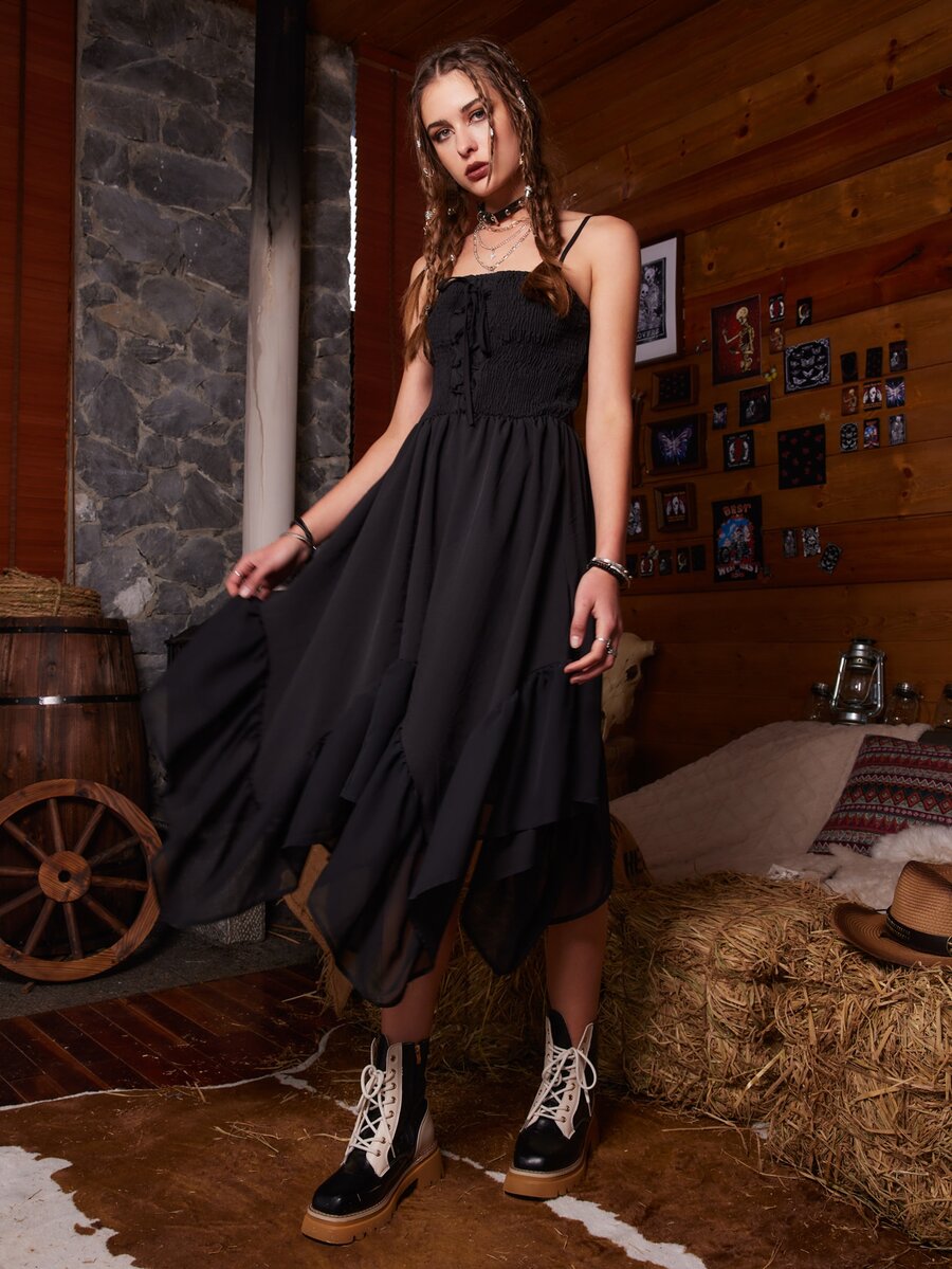 Goth Vestido de tirantes unicolor con cordón con fruncido