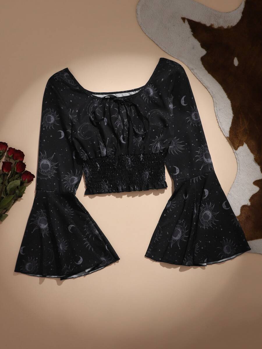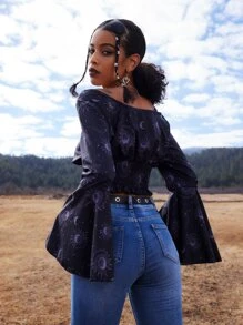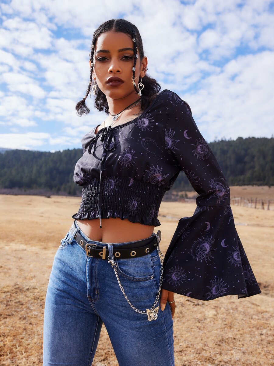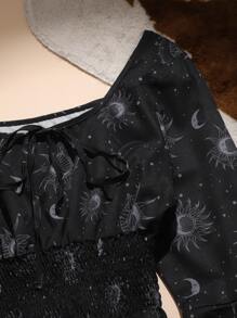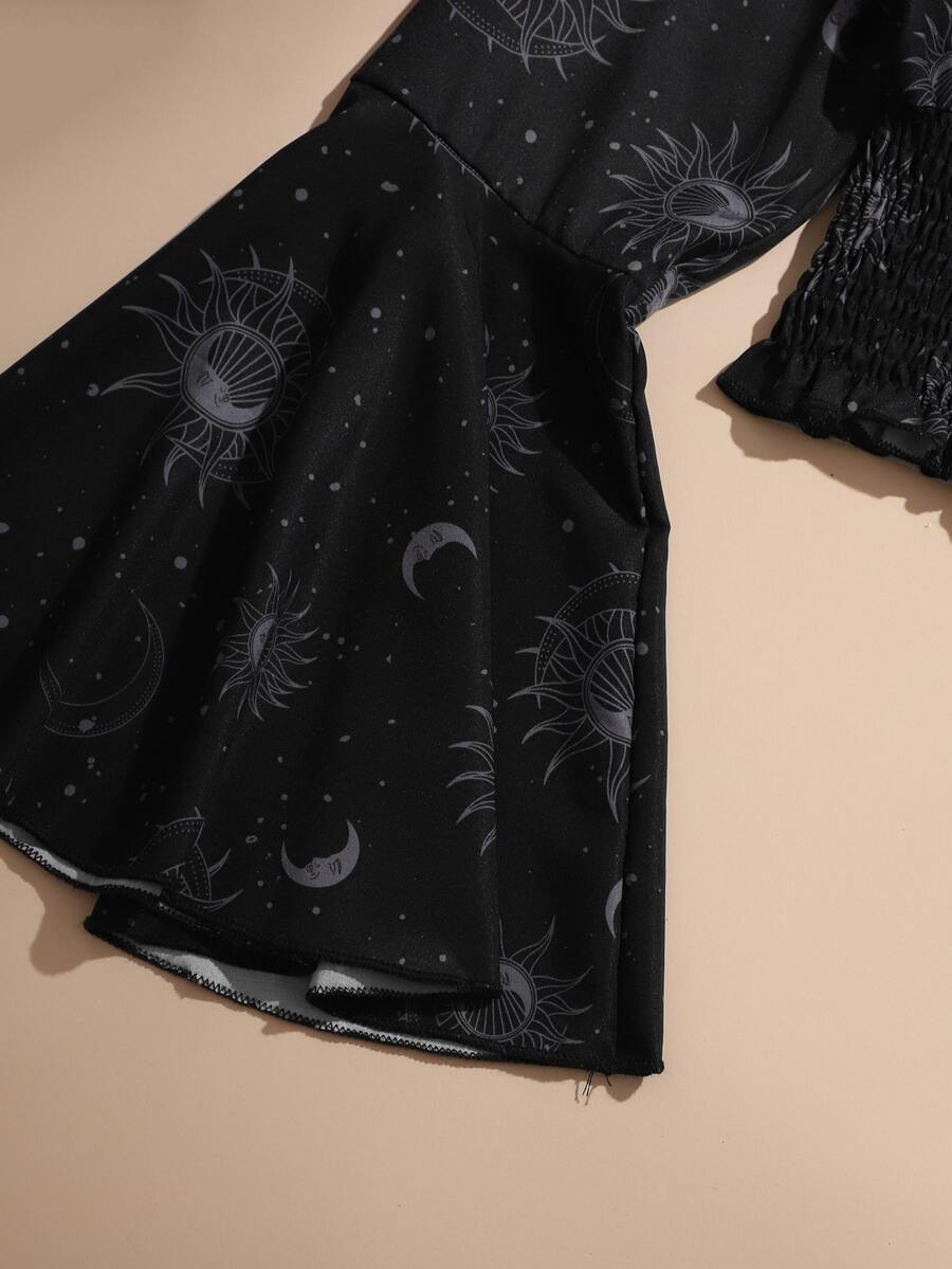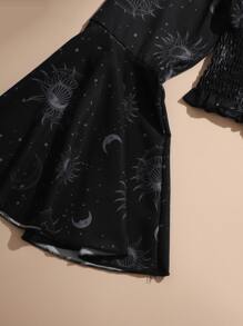 Goth Blusa con estampado de sol y luna con fruncido de manga con volante