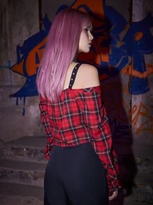 Grunge Punk Top corto de cuadros con ojal de hombros descubiertos