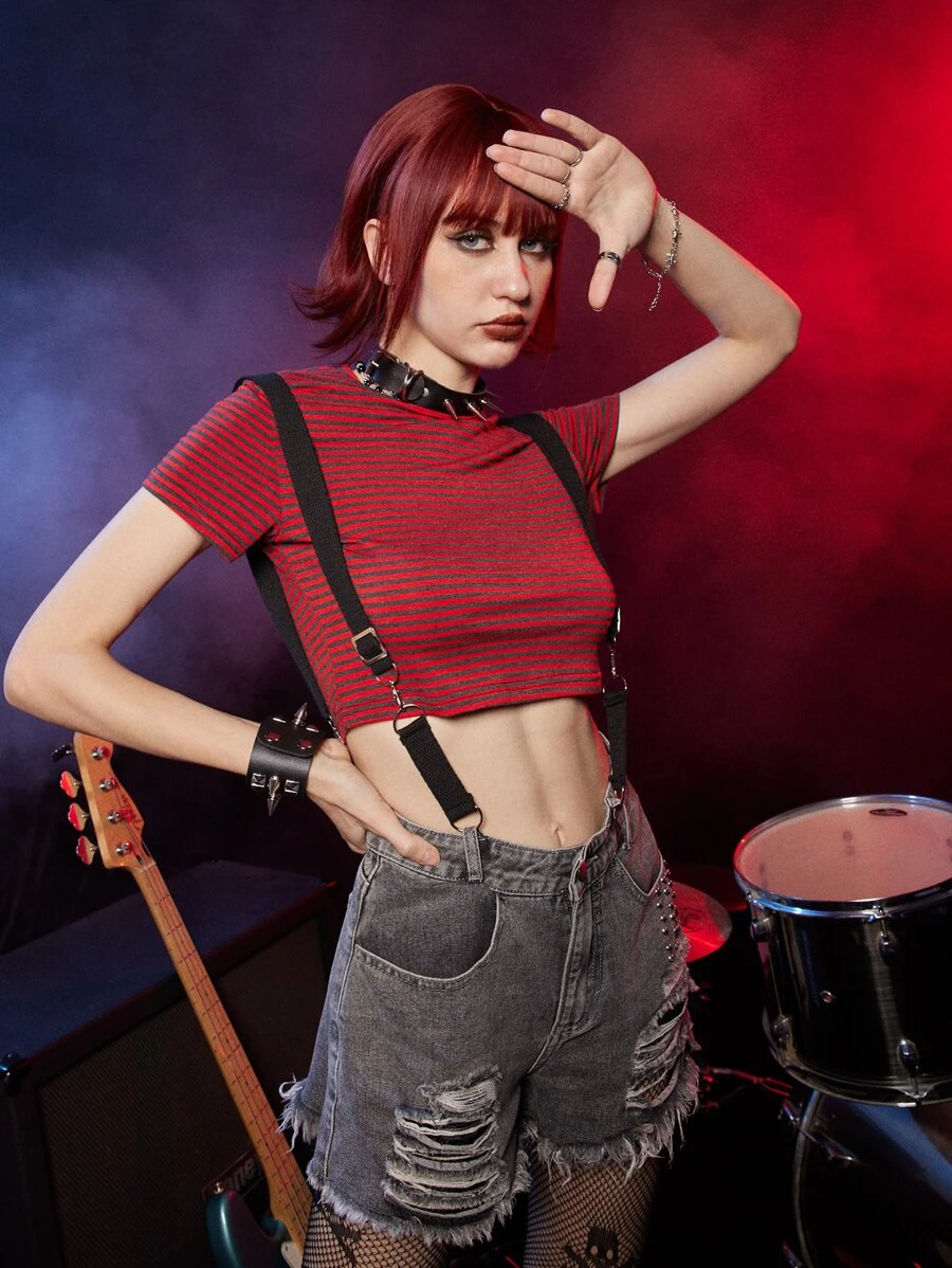 Grunge Punk Shorts en mezclilla desgarro con cinta tirantes