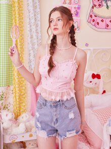 Kawaii Top de tirantes con estampado floral ribete con encaje