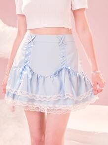 Falda De Encaje Con Cordones, Con Encaje De Contraste Y Dobladillo De Volantes