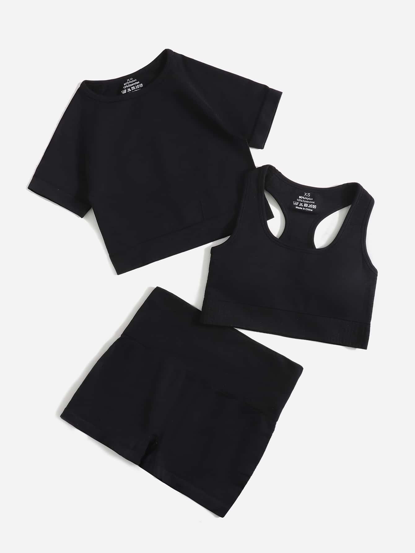 Conjunto de Yoga inconsútil de 3 piezas, traje deportivo con espalda de corredor, Sujetador deportivo, Camiseta corta de cuello redondo, shorts de cintura ancha