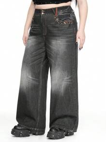 Grunge Punk Jeans de pierna acampanada de talle bajo holgados con diseño vintage desgastado y tachuelas para mujer de tallas grandes