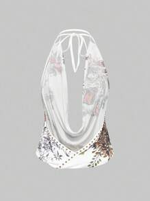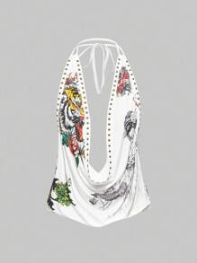 Grunge Punk Top sin mangas con cuello profundo drapeado, estampado retro Y2K con cabeza de tigre vintage y geisha floral, con tachuelas y rhinestones sexy, para mujeres