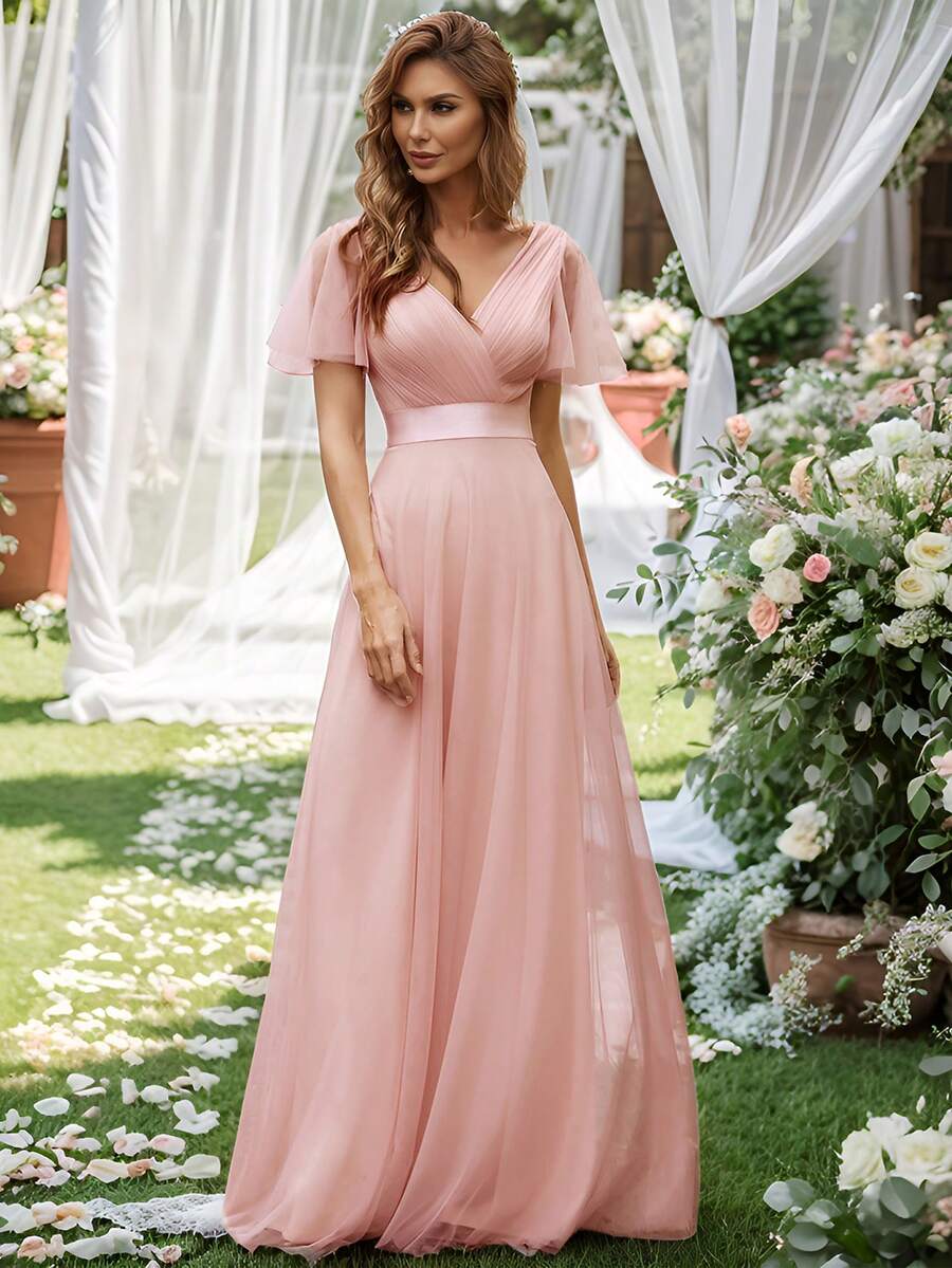 Vestido de dama de honor romántico de línea A con escote en V, transparente y de color rosa, adecuado para invitados de boda, ocasiones formales, Día de San Valentín, fiesta de cumpleaños
