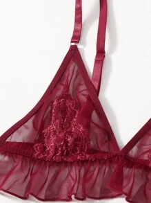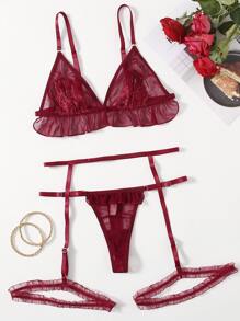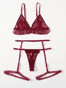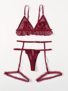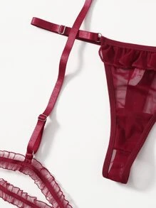 Conjunto De Lencería De Rejilla Con Liguero Y Adorno De Volantes