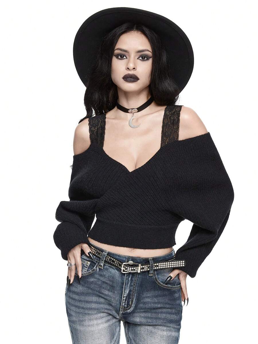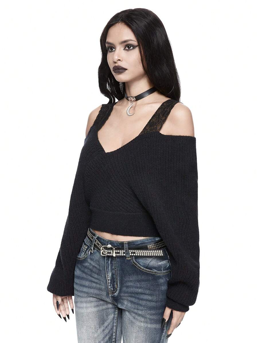 Jersey de punto con cuello en V sexy, hombros descubiertos, tirantes de encaje, manga larga - Estilo francés