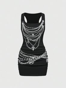 ROMWE Avant Vestido corto de tirantes con cuello redondo y escote bajo, con decoración de cadena negra y estampado, adecuado para verano, playa, graduación, Pascua, conciertos, vacaciones en Nashville, festivales de música