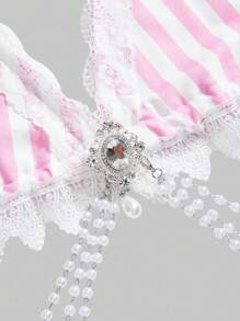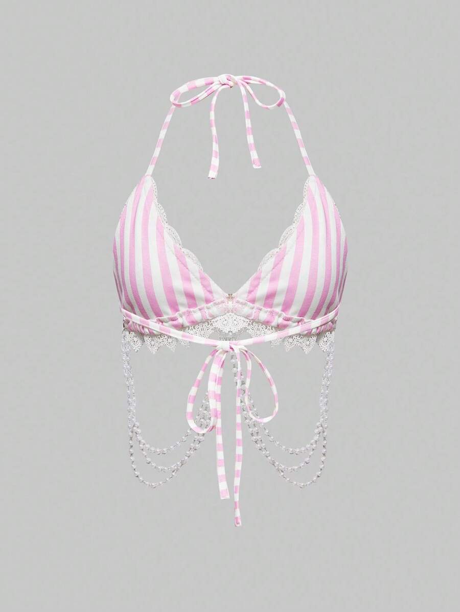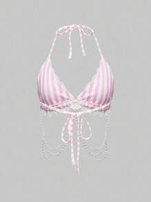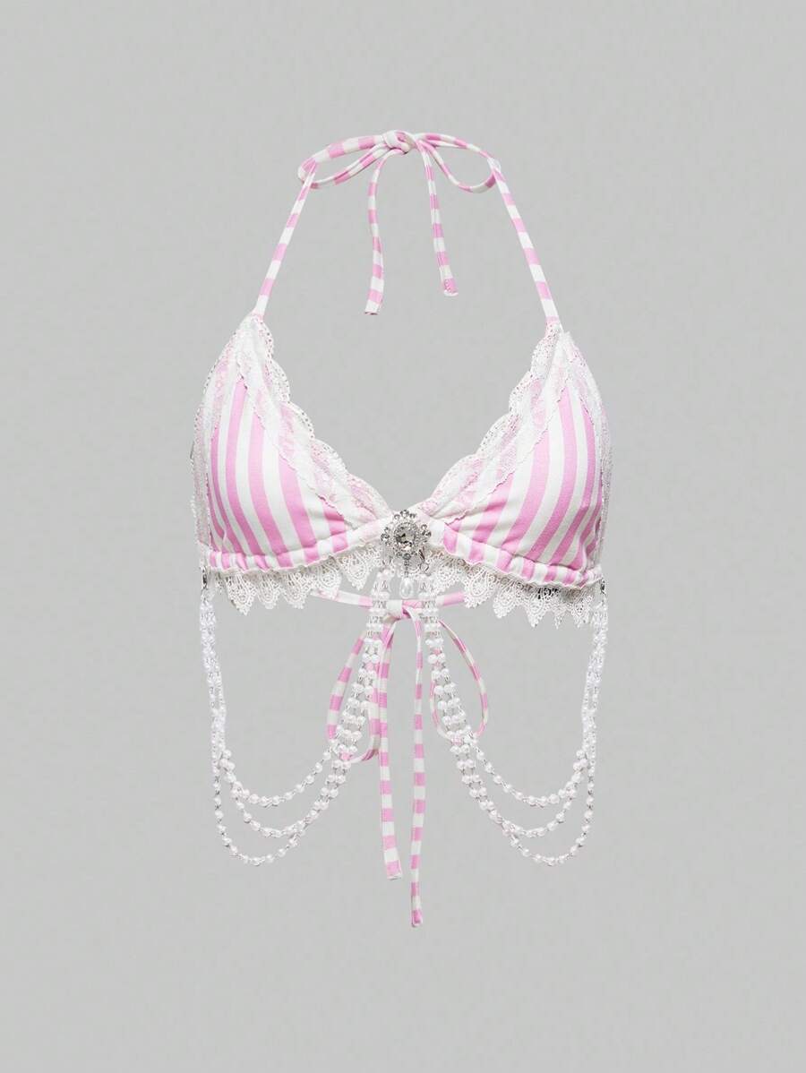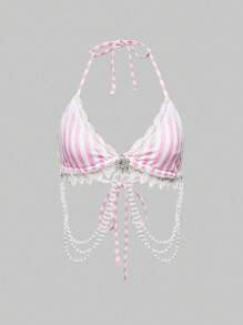 Goth Top de bikini de cuello de halter sexy con cristal y rayas verticales negras y blancas para mujer, estilo gótico