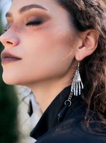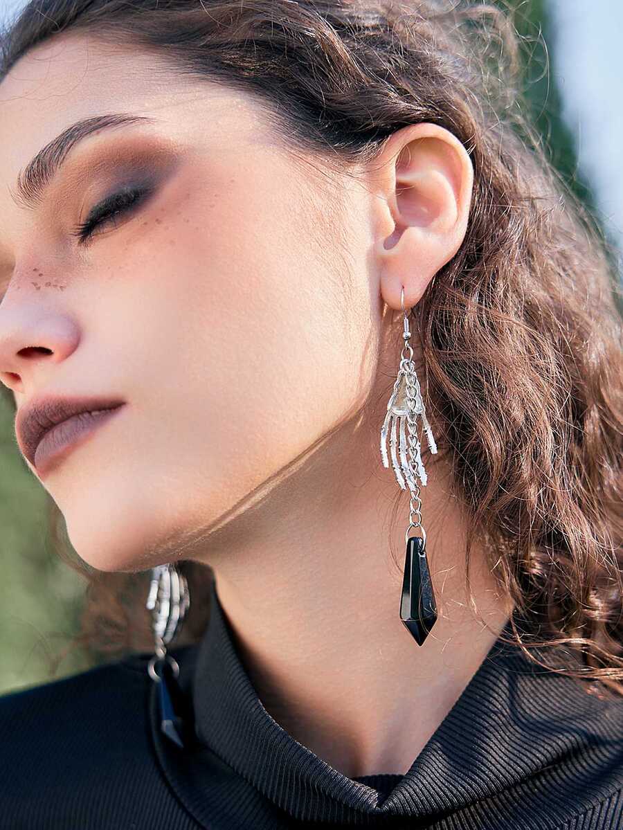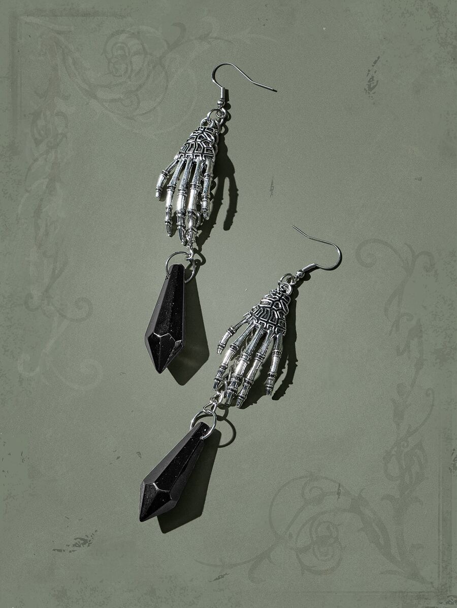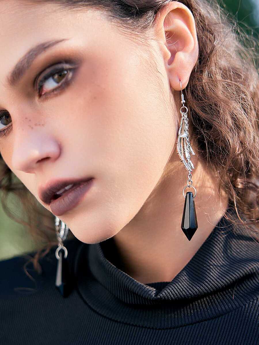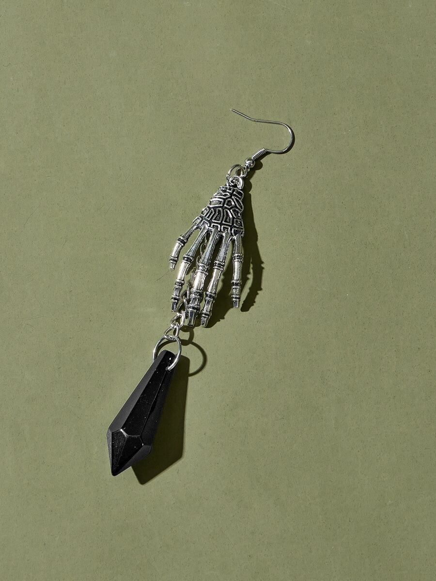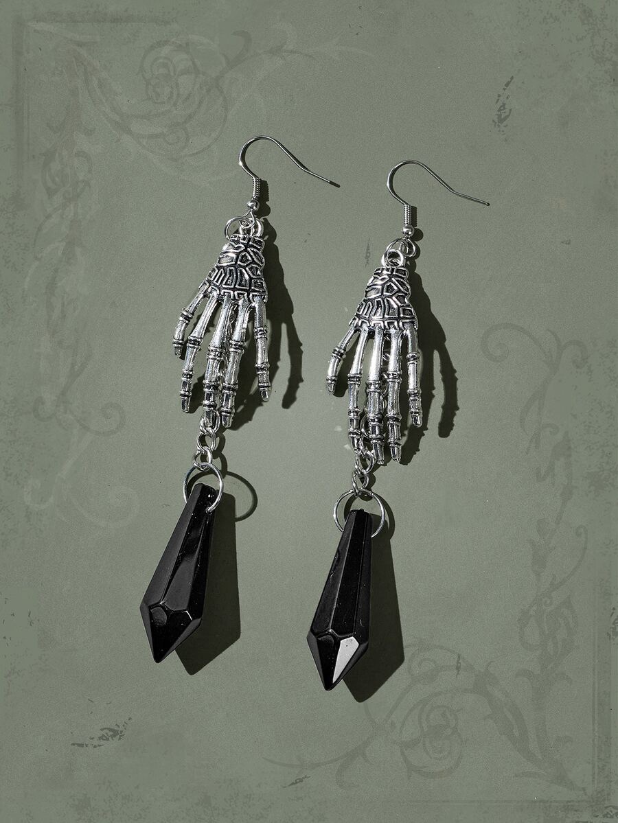 Goth Pendientes largos esqueleto mano & piedra preciosa