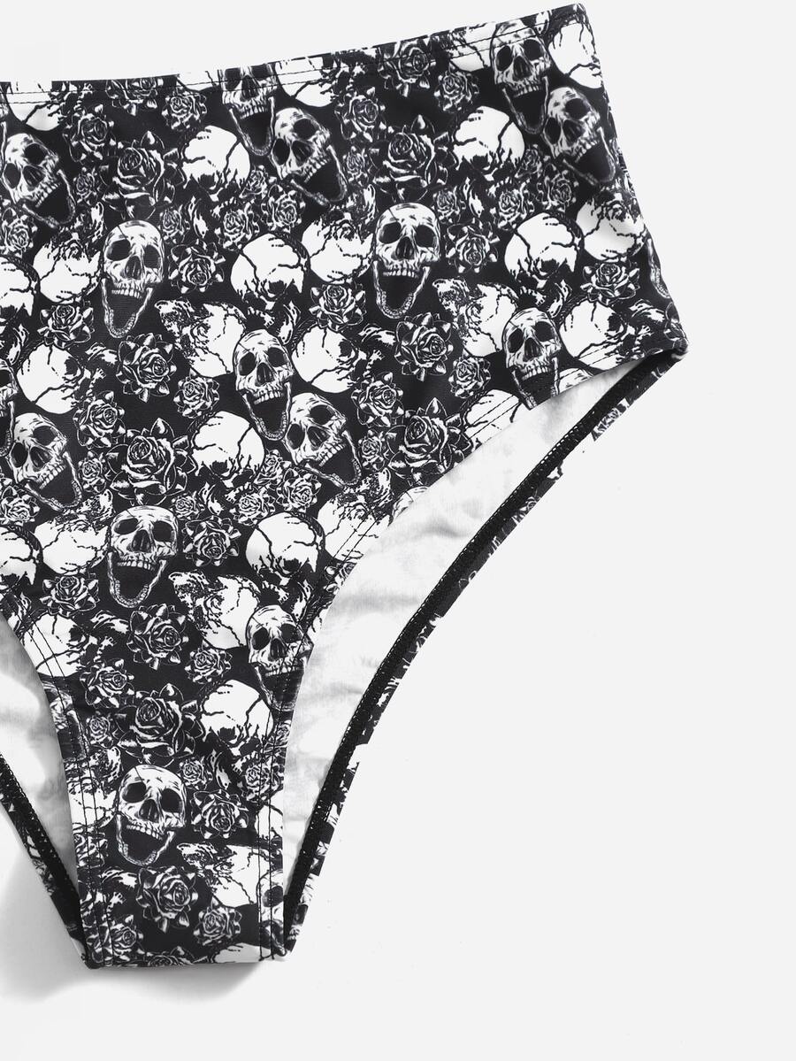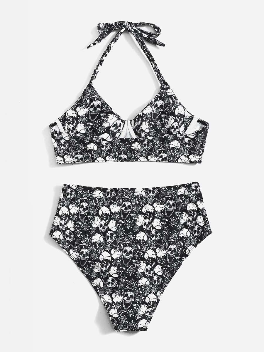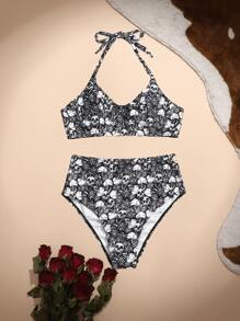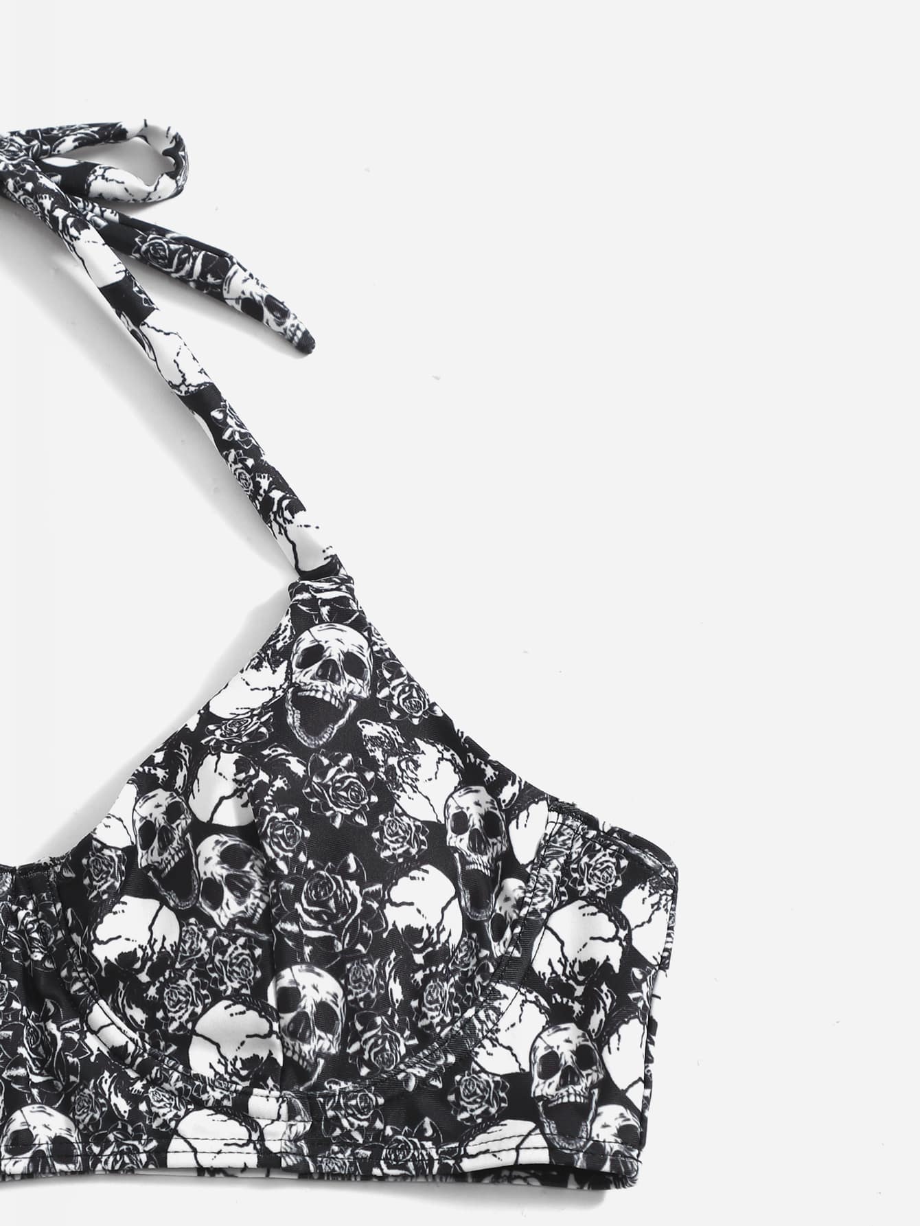 Fairycore Bikini de cuello halter con gráfico de calavera y flores