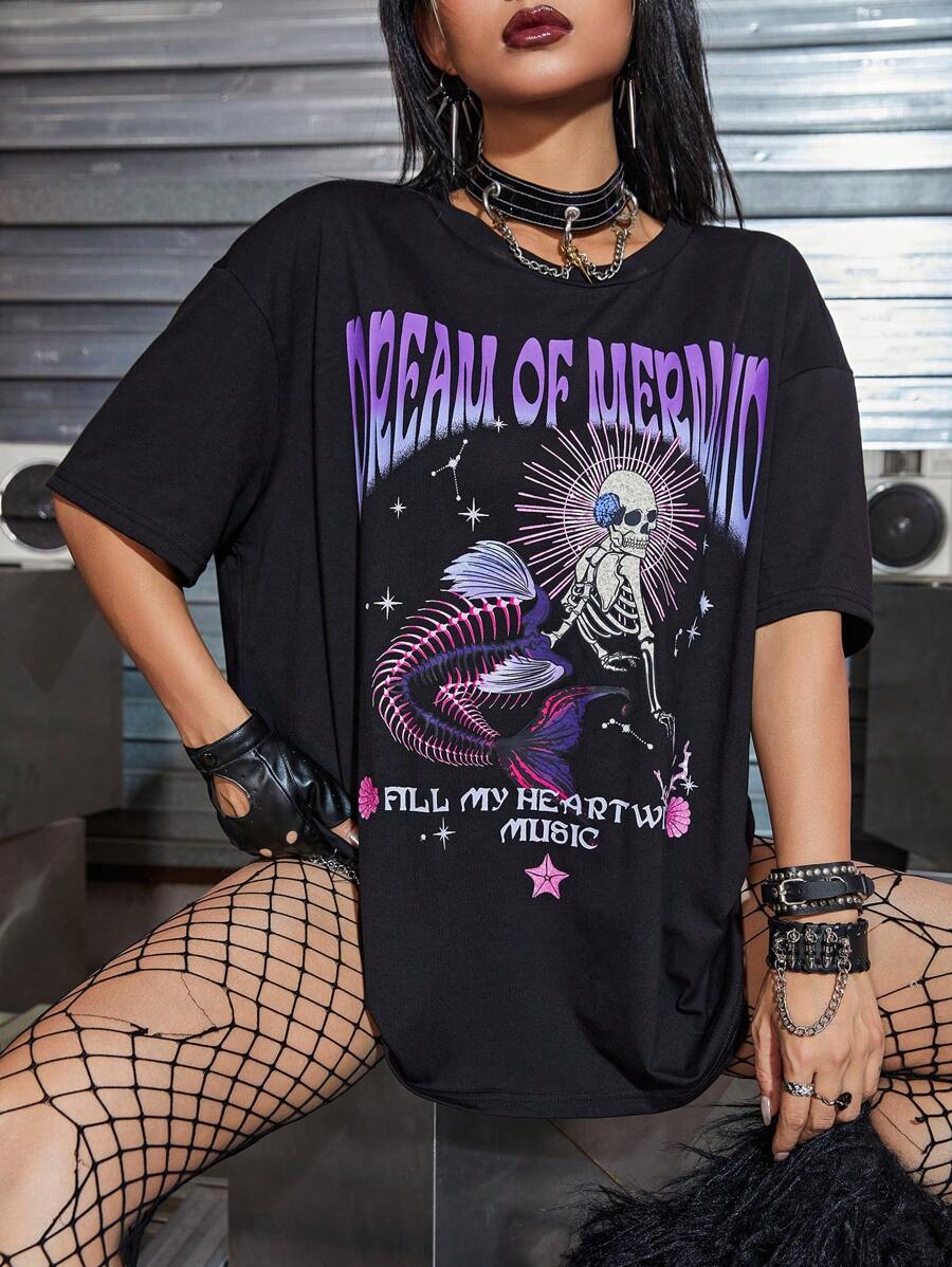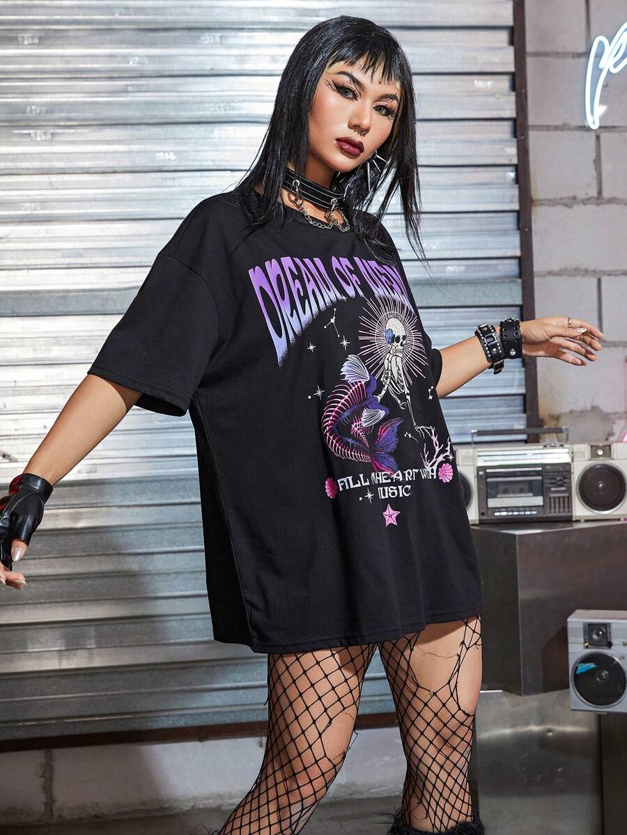 Camiseta amplia con estampado de cráneo y letra de hombros caídos