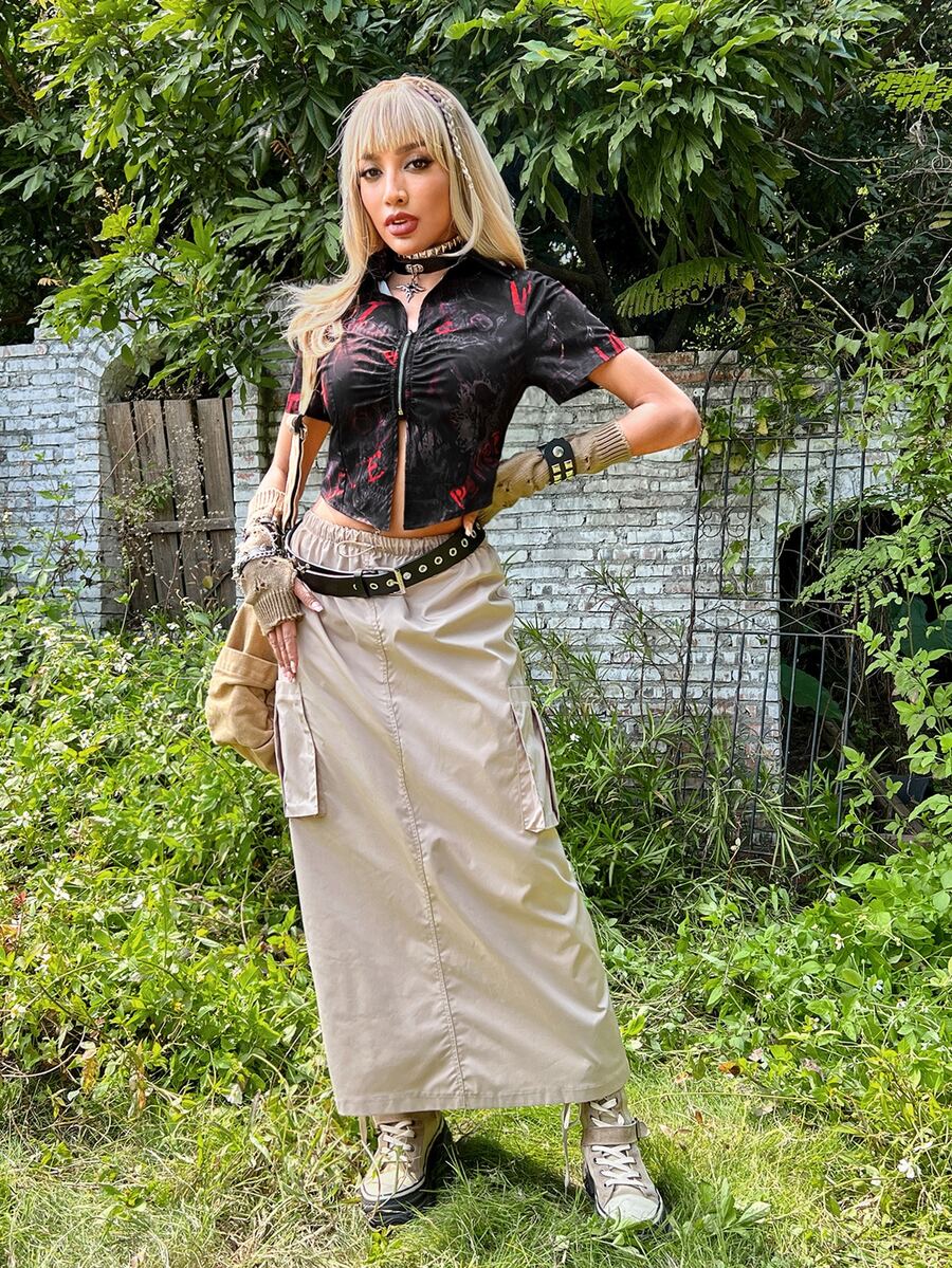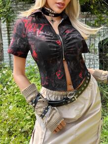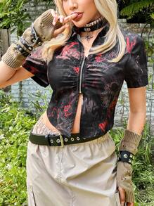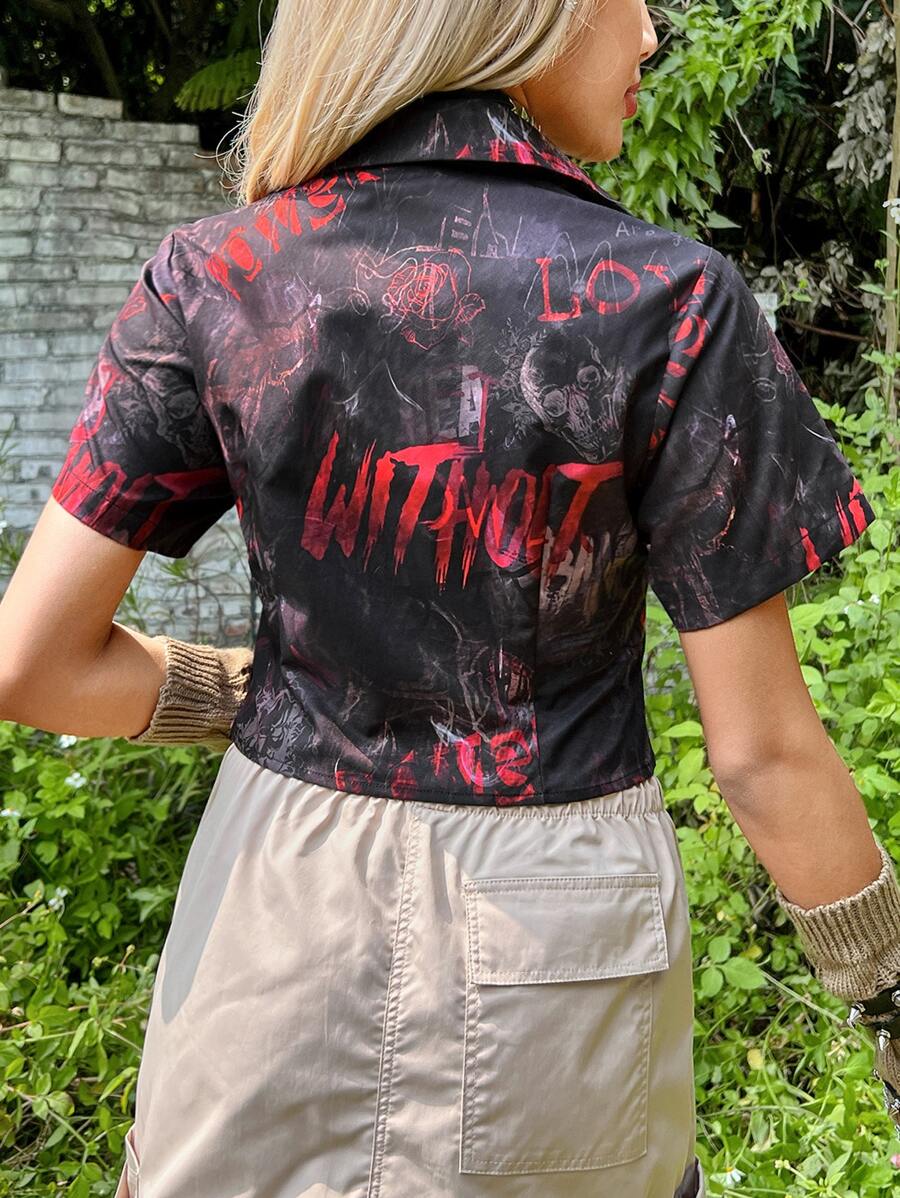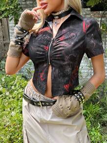 Camisa crop con estampado de cráneo y letra con cremallera bajo asimétrico