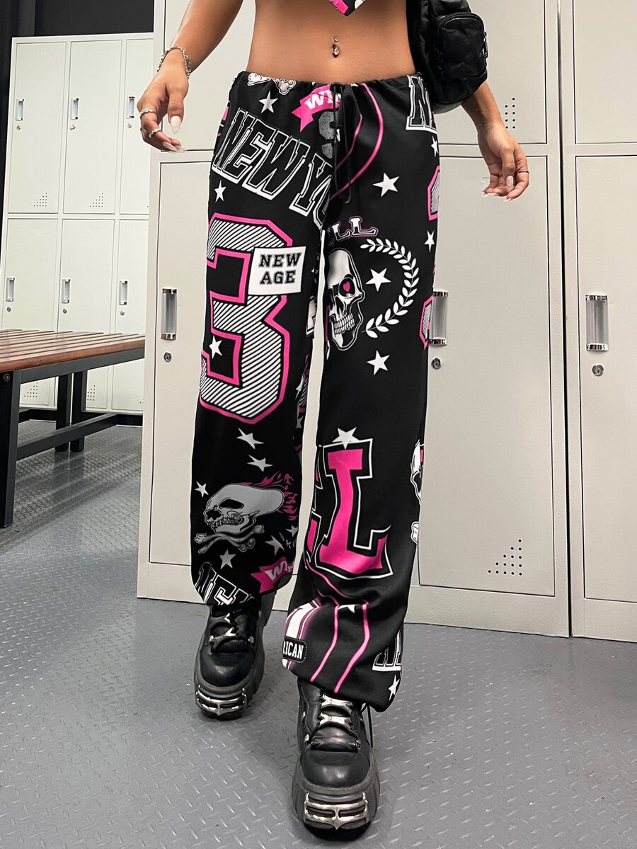 Pantalones rectos estampado de cráneo de cintura con cordón