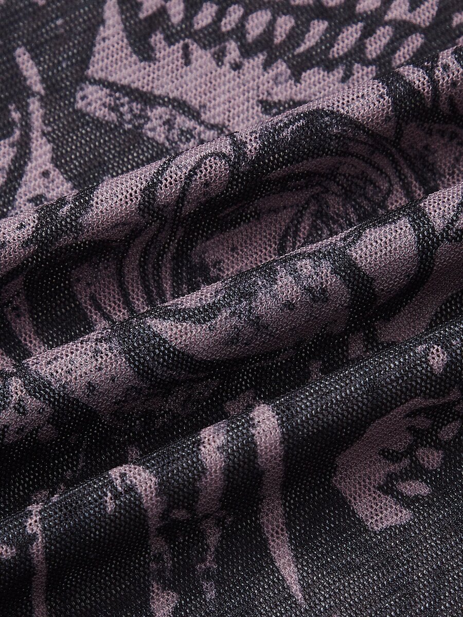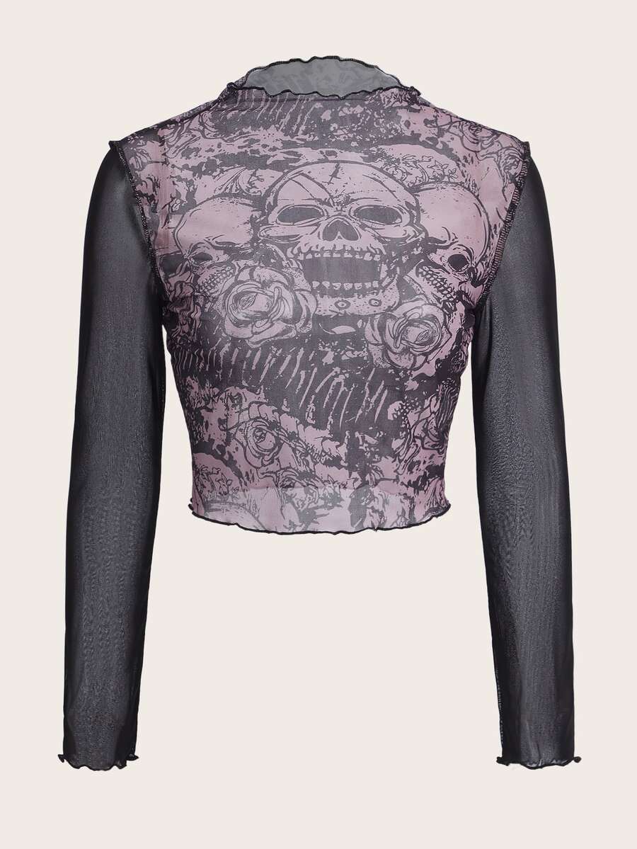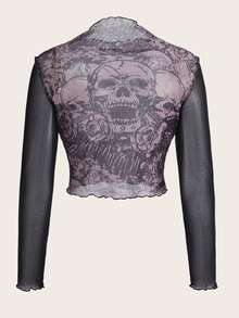 Top estampado de cráneo ribete en forma de lechuga de malla