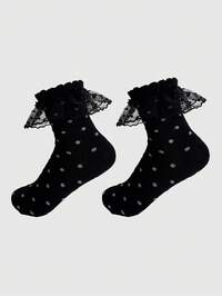 Kawaii Calcetines de tripulación lindos con estampado de lunares, empalme de malla y ribete de volantes para mujer