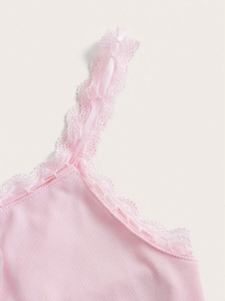 Kawaii Top de tirantes unicolor con encaje en contraste