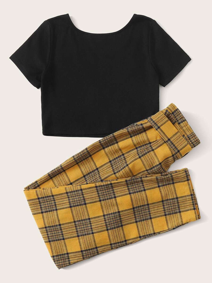 Conjunto top corto unicolor con pantalones con cinturón de tartán