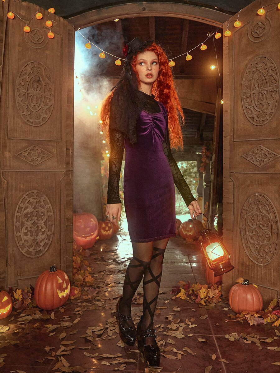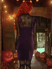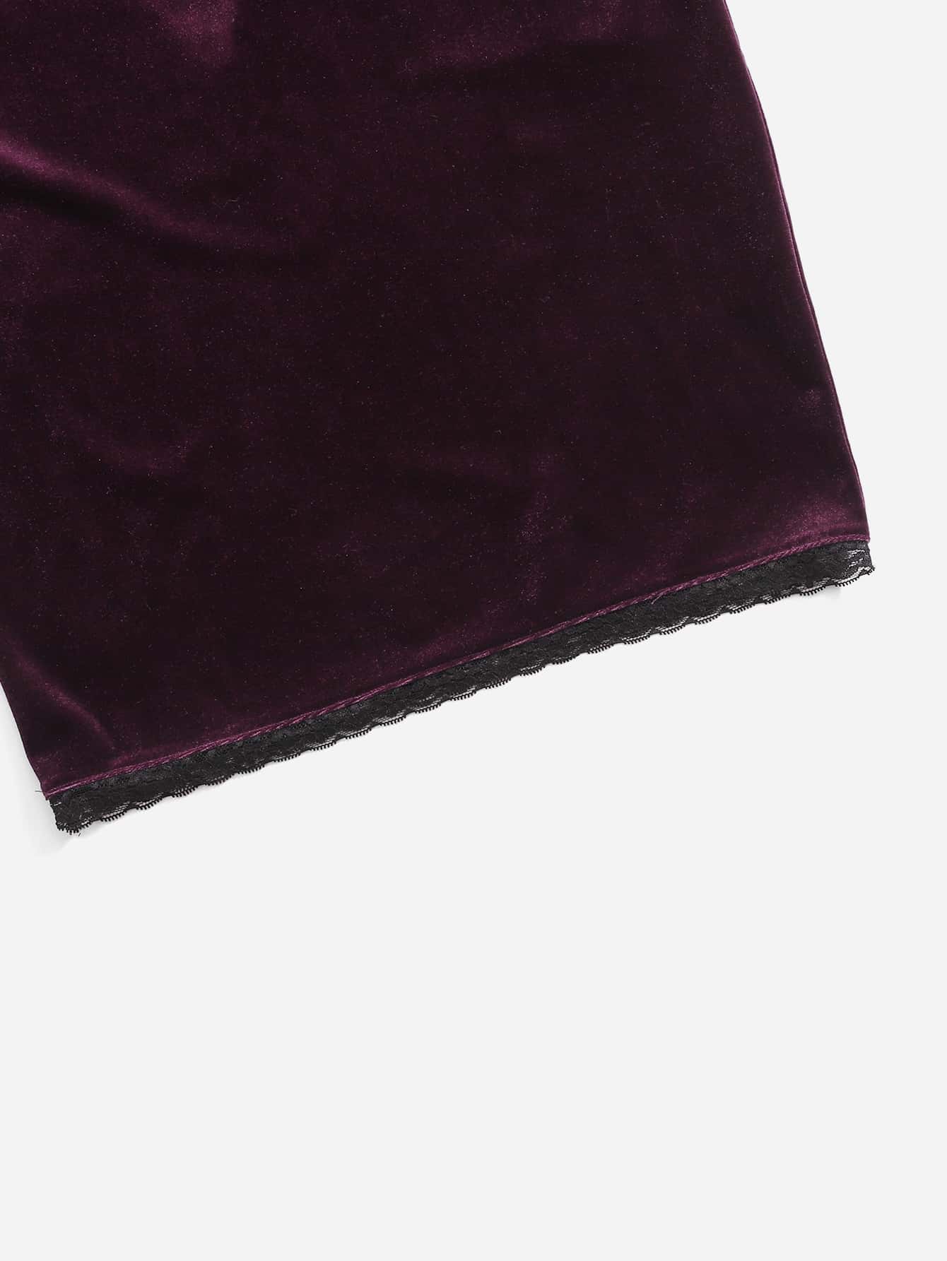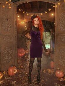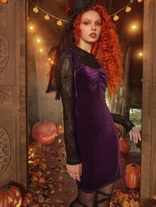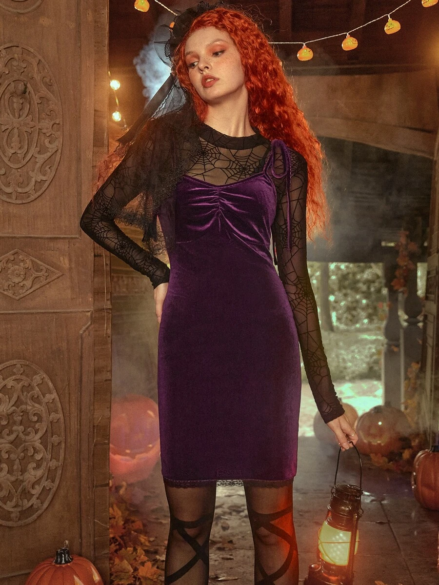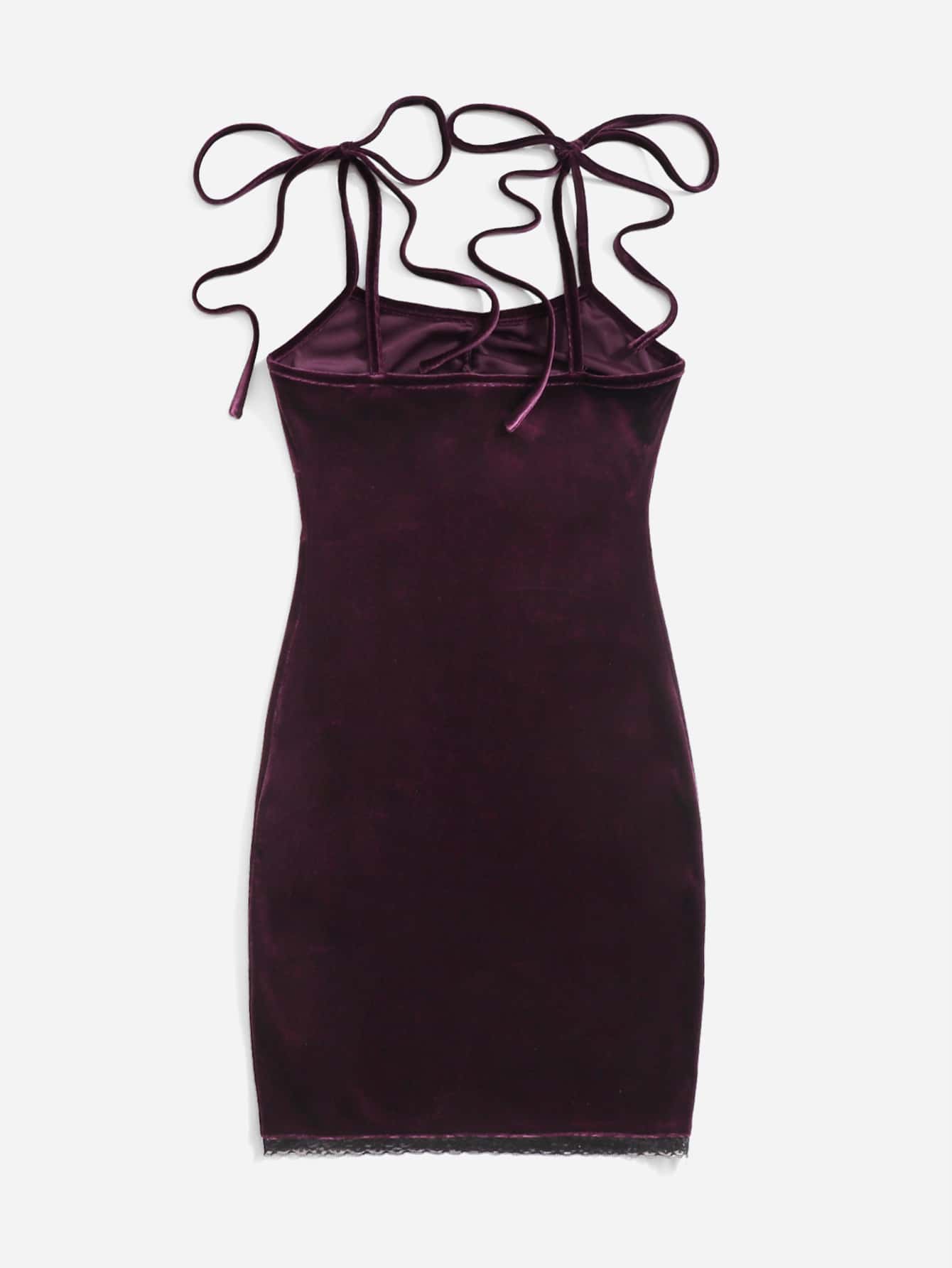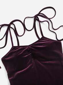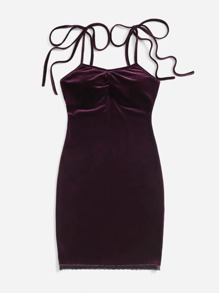 Vestido unicolor de terciopelo fruncido de hombros con cordón