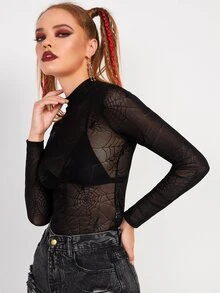 Top araña con telaraña patrón de cuello alto con encaje sin sujetador